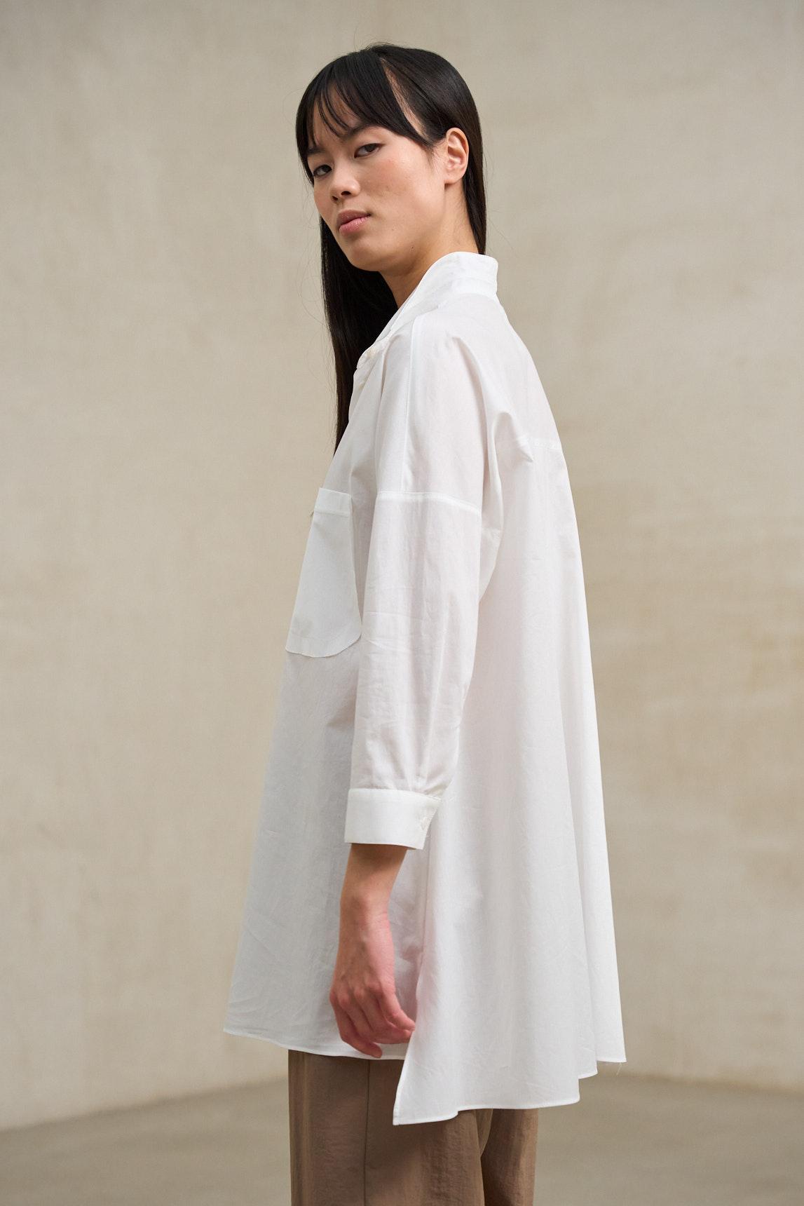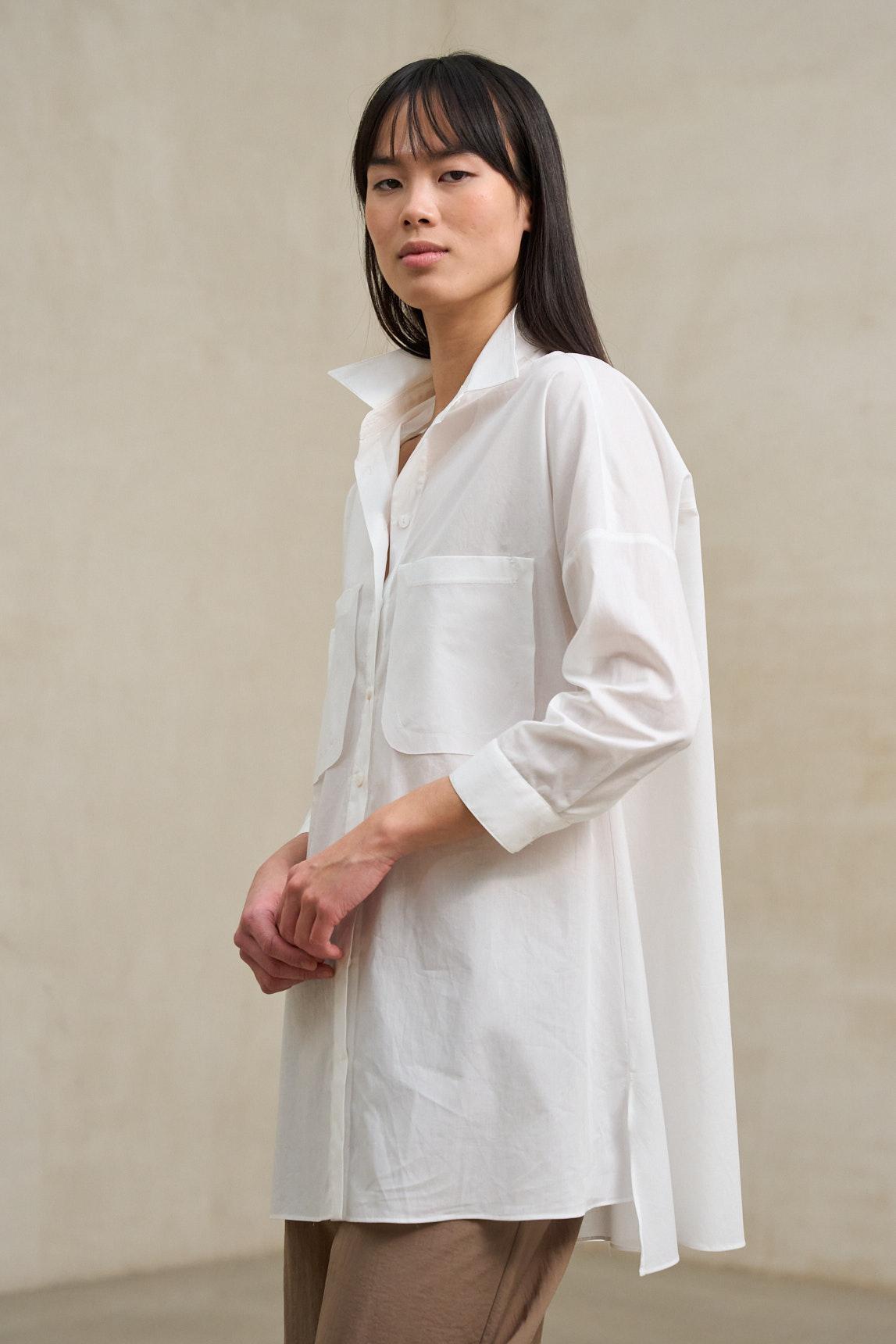 The Nerela white shirt reinterprets the classic shirt in a more relaxed and contemporary version. Made from a lightweight, flowing fabric, it features a shirt collar, a slightly open neckline without a full button placket, and long sleeves with single cuffs. Its relaxed silhouette and straight hem offer comfort and freedom of movement, allowing it to be worn loose or slightly tucked in to structure the look. The clean front design, with a partial placket opening, maintains a refined and versatile aesthetic. White brings brightness and freshness, serving as an essential base for neutral outfits or bolder contrasts with black, camel, or olive green. It's a garment designed for everyday wear, ideal for a relaxed office look, travel, or minimalist ensembles with character. A timeless shirt that balances simplicity, soft structure and natural elegance. We strive to display colors as accurately as possible, but they may vary slightly from reality.