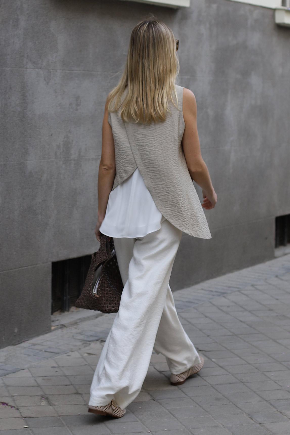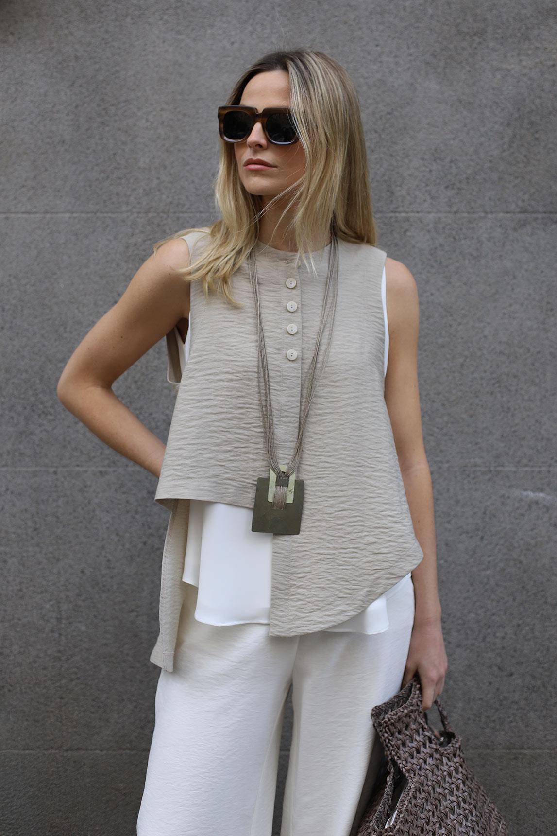 With a rounded neckline and a sleeveless design, this vest stands out for its visible front button closure, which provides a subtle and neat detail. The surface has a slightly wrinkled texture that adds depth to the stone tone, and the silhouette is wide and flowing, finished with an asymmetrical hem with a side extension that adds movement and a special touch.