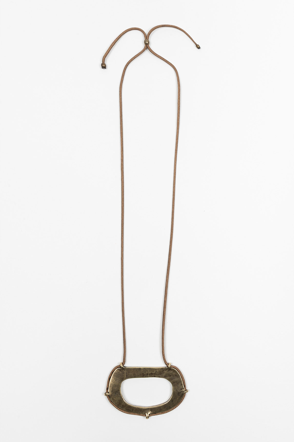 Long necklace with an organic, openwork oval metal centerpiece plated in antique brass, providing a rustic yet contemporary touch. Its sturdy yet visually lightweight structure makes it an accessory with character and balance.