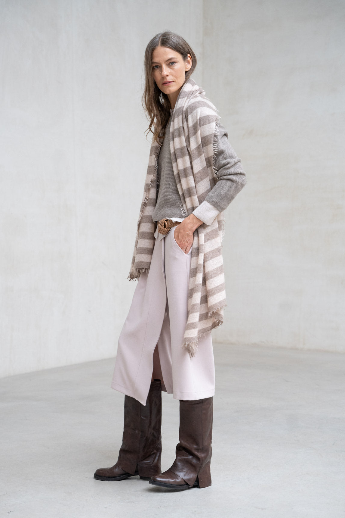 Discover Rivera's beige striped scarf, a winter-inspired design with wide stripes in beige and taupe. Made from cashmere, it offers a wraparound texture perfect for providing warmth while remaining lightweight. Its diagonal striped pattern adds dynamism and pairs easily with plain garments or earth tones. The fringed edges provide a relaxed finish that reinforces its casual and natural character. A versatile and functional option for everyday wear, ideal as an accessory for urban, neutral, or bohemian looks.