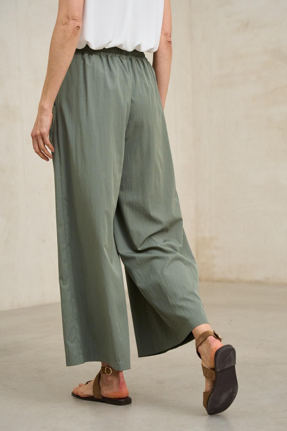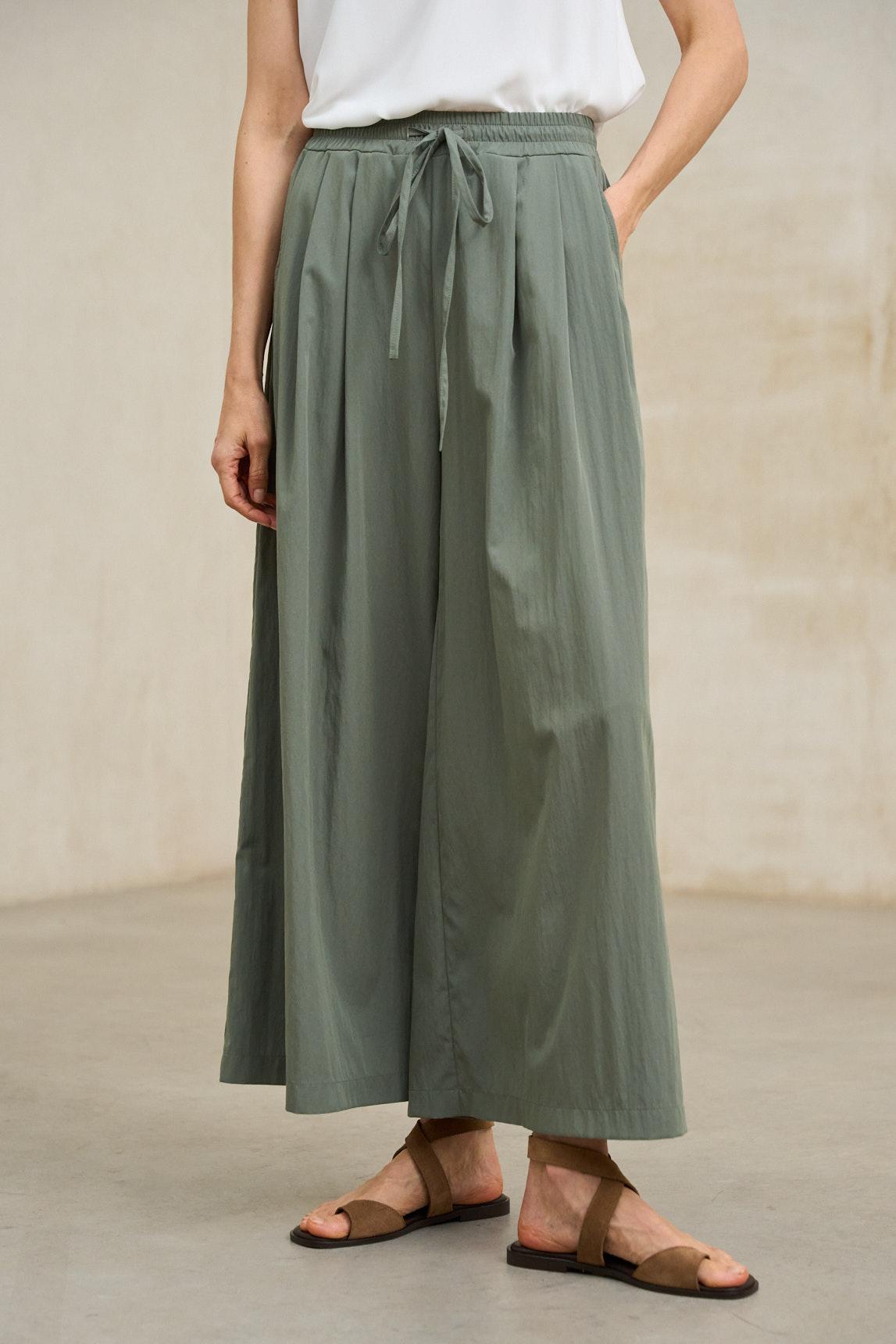 Pantalón de mujer confeccionado en tejido ligero y fluido con caída natural. Cintura elástica con fruncido y cordón ajustable que aporta confort y adaptabilidad. Presenta bolsillos laterales discretos y pernera ancha con pliegues verticales que estilizan la figura y favorecen el movimiento.