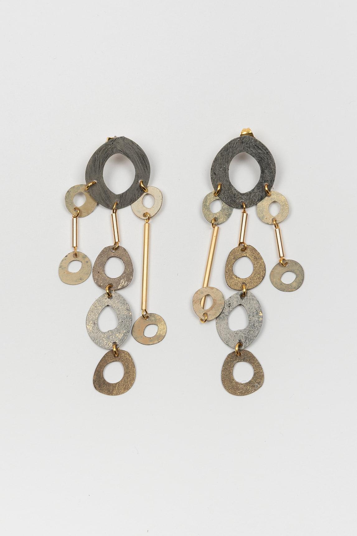 *THIS PRODUCT CANNOT BE EXCHANGED OR RETURNED. Medium-length earrings with a dangling design and composition of circular hoops linked in different metallic finishes. The piece starts with a dark upper oval from which rounded shapes in gold, silver, and bronze tones descend, creating a light and visually dynamic drop. The surfaces have a smooth, matte texture that softens the shine and adds depth to the whole, while the vertical silhouette naturally slims and accompanies movement.