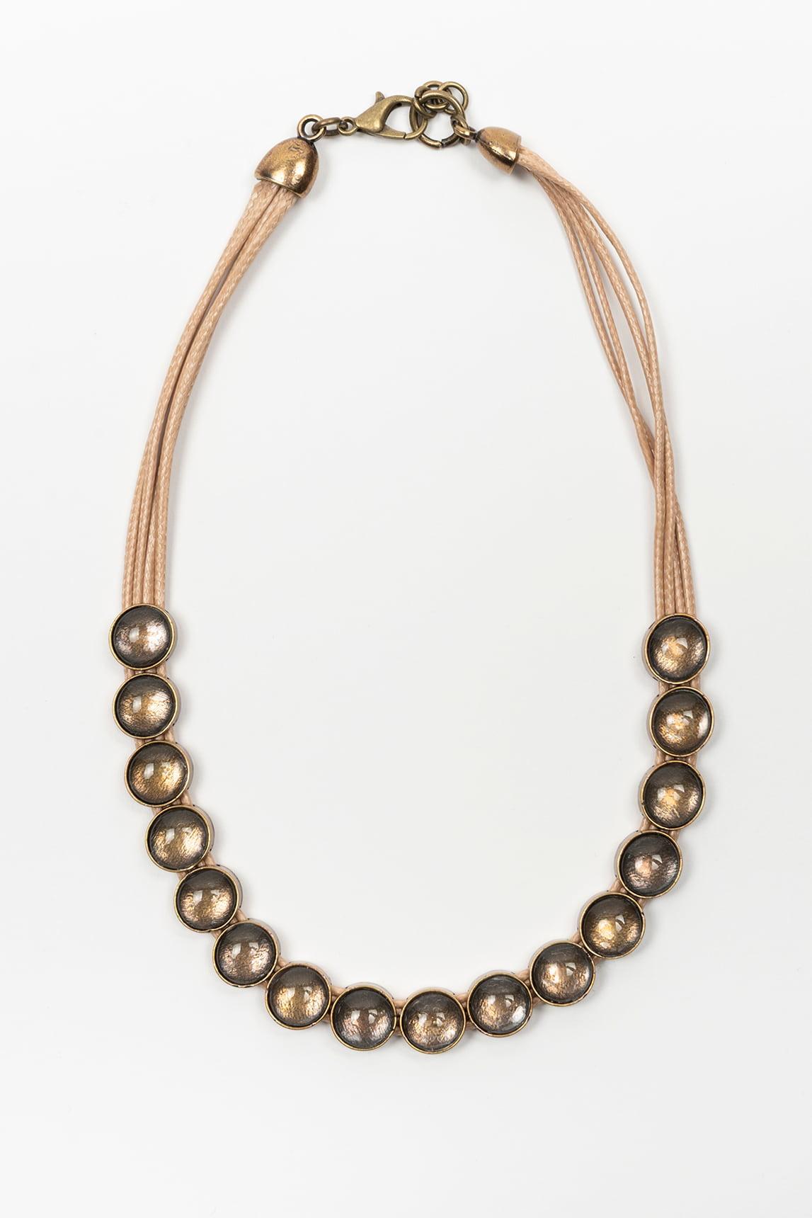 The Brisea necklace in brass features the same composition of central spheres accompanied by several fine strands that add texture and dimension. Its structured design balances modernity with a subtle artisanal feel. The brass finish offers a warm, natural, aged gold tone that pairs especially well with garments in ecru, sand, camel, or natural linen. The spheres add a distinctive touch that elevates any outfit without sacrificing elegance. It's a versatile piece that adds character to neutral looks and brings relaxed sophistication to your wardrobe. We strive to display colors as accurately as possible, but they may vary slightly from reality.