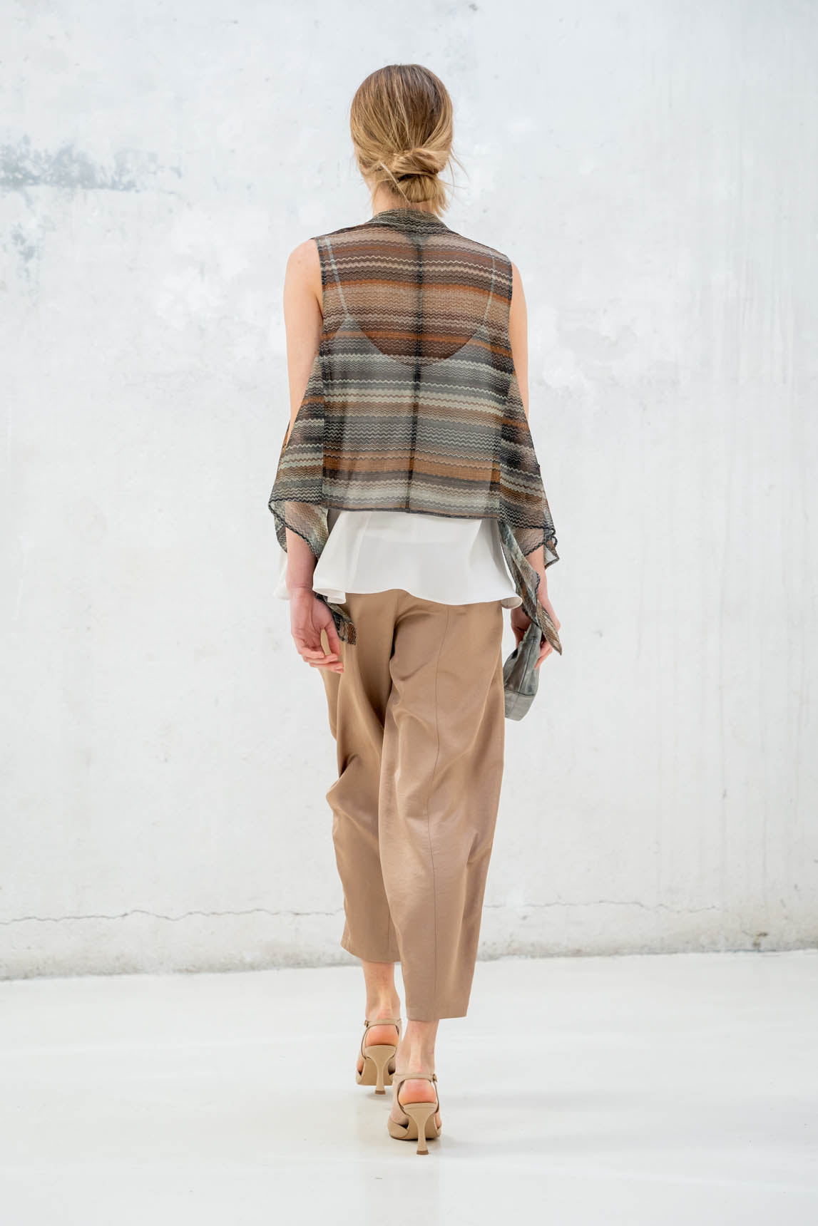 Dazzle in the Démeter waistcoat, a jewel with an asymmetric design that reflects the opulence of the lamé fabric and the zigzag print in copper, grey and blue tones, inspired by Greek grandeur. Its open and asymmetrical structure, with pointed sides, adds an avant-garde touch to your look. This waistcoat redefines contemporary elegance and is the perfect choice for the most special events.