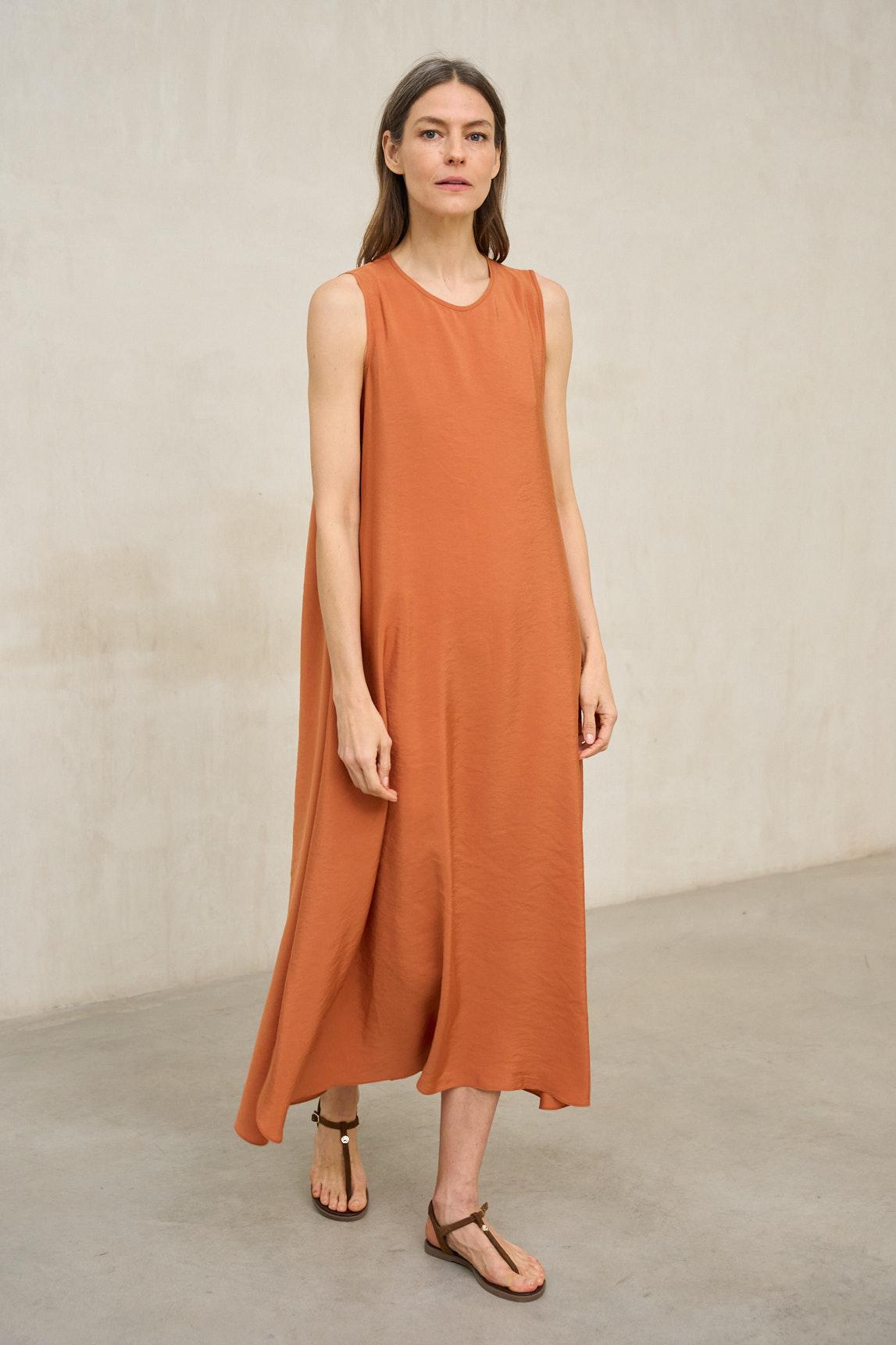 The Elara coral dress is a flowing garment with clean lines that stands out for its relaxed silhouette and natural movement. Its sleeveless design and round neckline maintain a refined and timeless aesthetic, while the A-line cut provides lightness and a flowing drape as you walk. The warm, luminous coral hue enhances a tan and adds energy to your look without sacrificing elegance. Its relaxed fit and lightweight fabric make it an ideal choice for the warmer months, offering comfort and sophistication in a single piece. Thanks to its loose pattern, it is a versatile dress that can be worn in a relaxed style with flat sandals or in more elevated versions with wedges or statement accessories. We strive to display colors as accurately as possible, but they may vary slightly from reality.