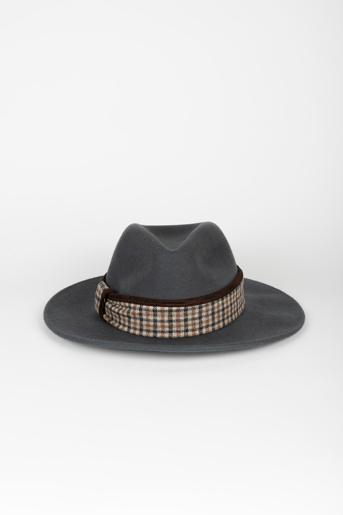 - Sombrero de fieltro con copa tipo fedora y ala media-ancha.