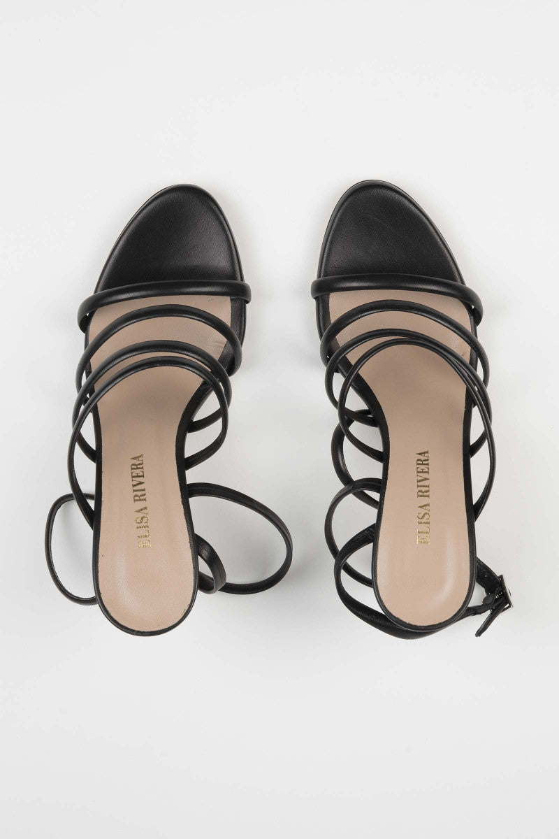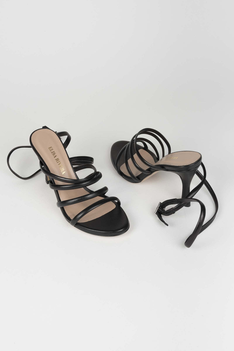 Descubre la exquisita Sandalia Marian negro de Rivera. Su diseño de tacón elegante y tiras horizontales en el empeine te brindan un estilo exclusivo. Cierre con tiras para atar al tobillo y combínalas con nuestros looks de Primavera Verano. Diseñado en Madrid para un toque de sofisticación en tu calzado.