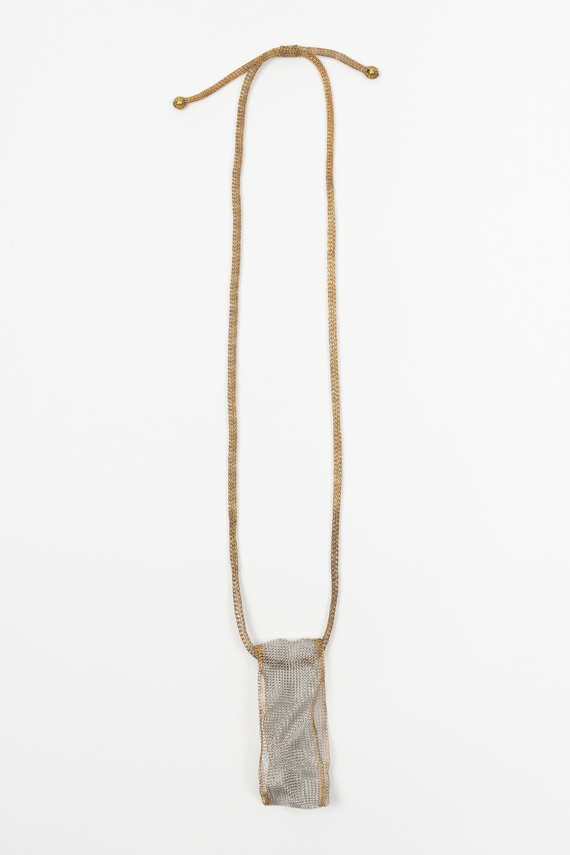 Collar largo confeccionado en malla metálica suave y maleable, con una caída fluida que aporta movimiento y carácter a cualquier look. La combinación de tonos dorado y plateado crea un contraste sutil y luminoso que lo convierte en una pieza muy versátil.