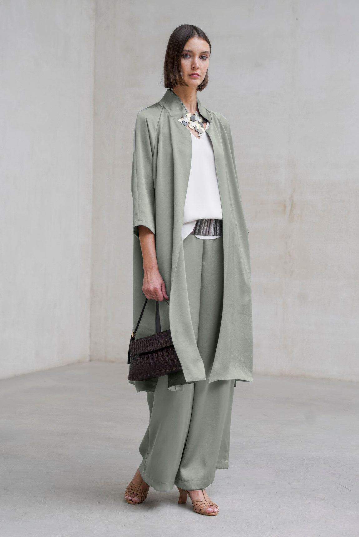 - Fajín de tejido estructurado con rayas en tonos verde oliva, rosa empolvado y gris antracita.