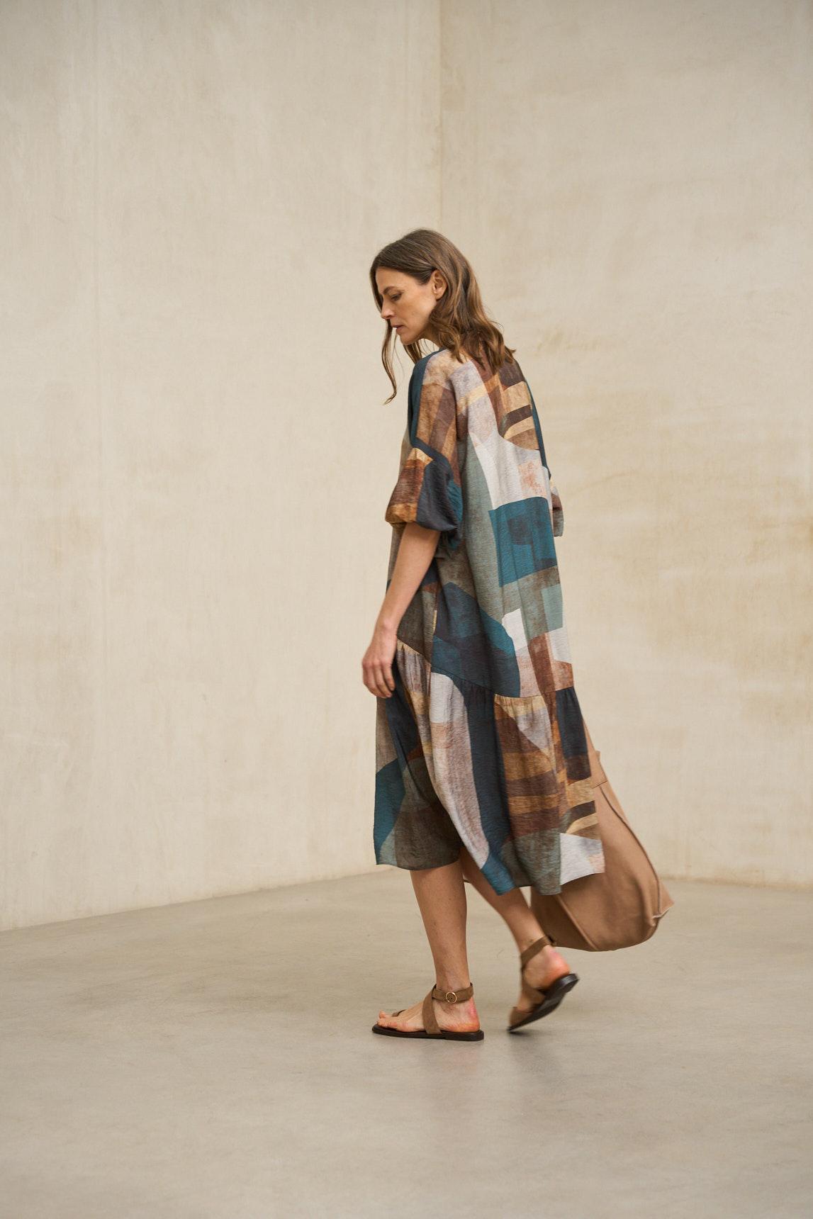El vestido Elvina estampado abstracto destaca por su diseño fluido y su juego cromático en tonos verdes, azul petróleo y matices tierra sobre base clara. Su silueta amplia y recta aporta movimiento y ligereza, creando una caída natural que estiliza sin ceñir.