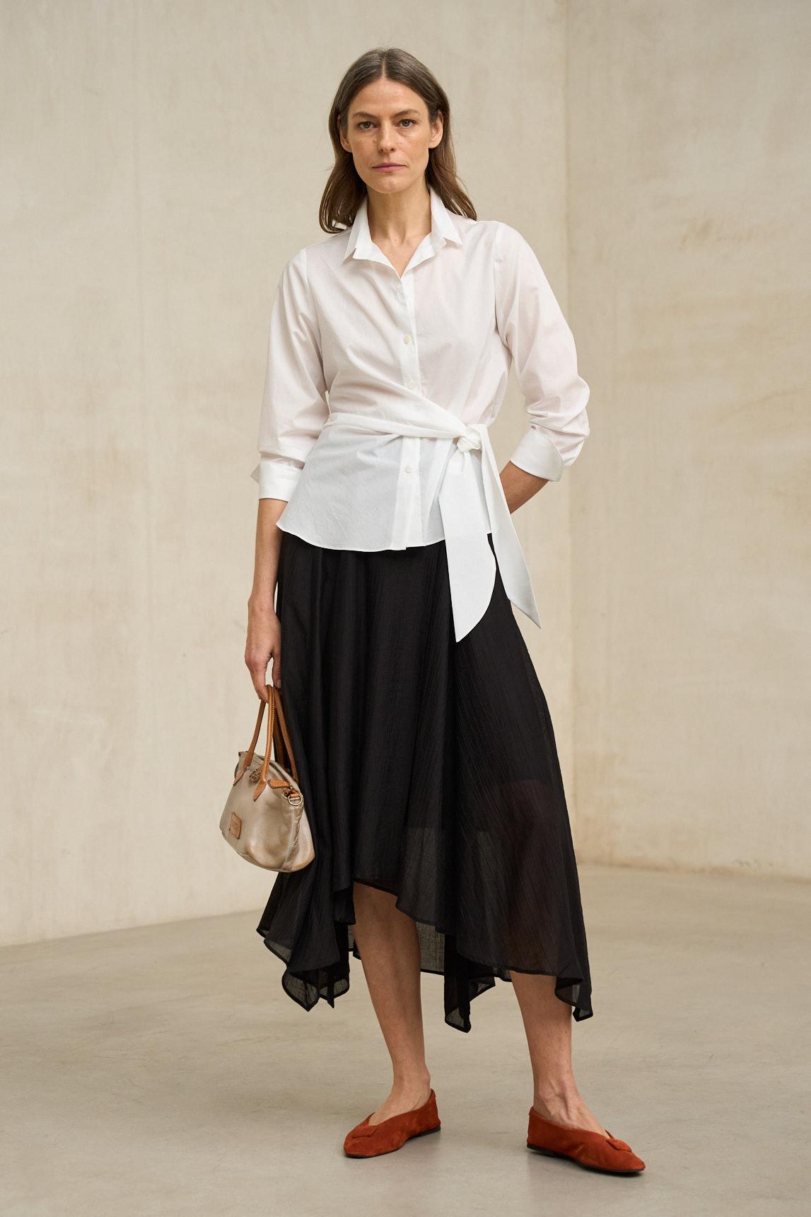 Falda midi confeccionada en tejido ligero y fluido que aporta movimiento natural al caminar. Presenta cintura limpia y silueta evasé con bajo ligeramente asimétrico, creando una caída elegante y dinámica que estiliza la figura sin marcar.