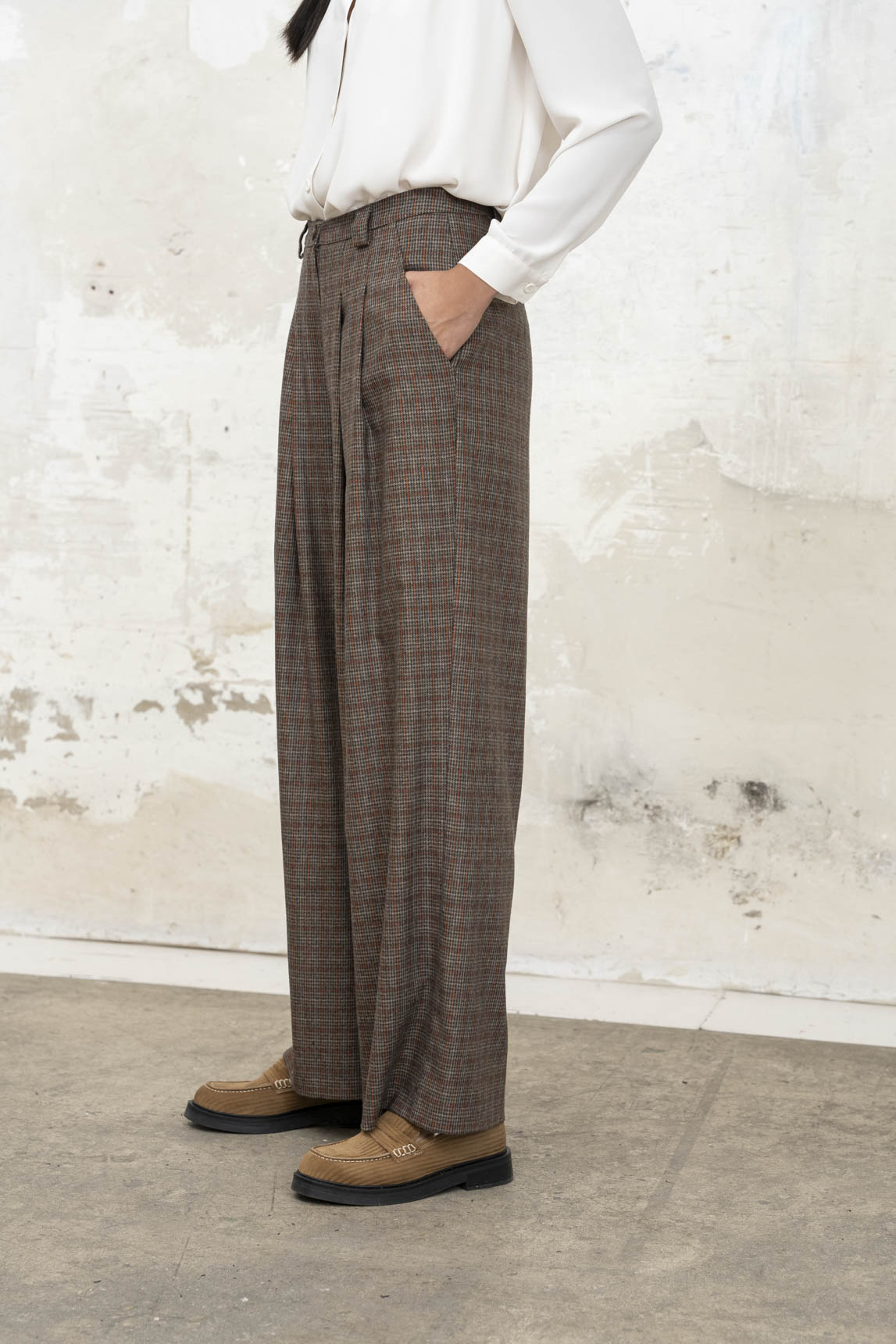 Descubre el pantalón Aretha de cuadros escoceses en tonos marrones, una pieza audaz y elegante que aporta un toque clásico a tu estilo. Con diseño de pierna ancha y pinzas, este pantalón ofrece una silueta sofisticada y cómoda. El patrón de cuadros escoceses añade un aire de distinción, perfecto para crear looks formales o darle un giro a tus looks del día a día.