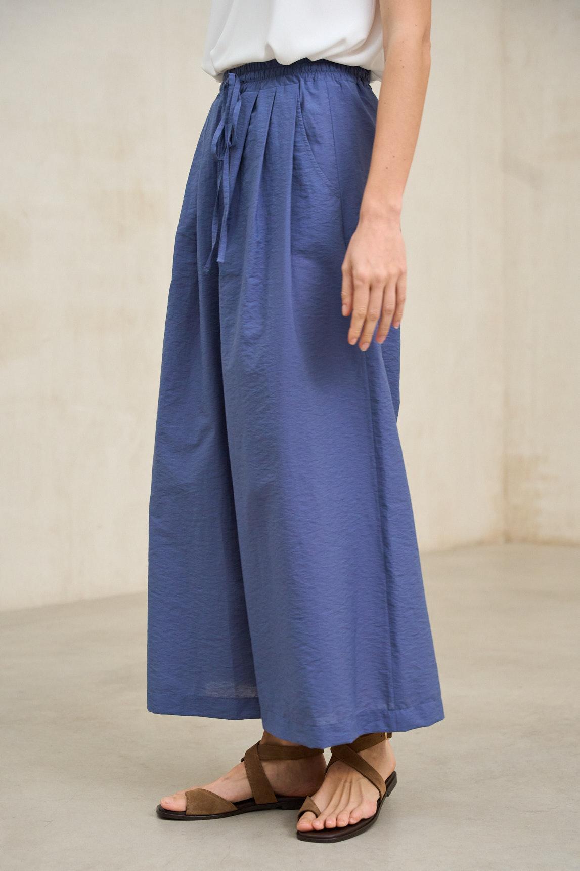 Pantalón de mujer confeccionado en tejido ligero con textura arrugada de aspecto natural, suave al tacto y con caída fluida. Presenta cintura elástica con cordón ajustable que permite un ajuste cómodo y adaptable. Incorpora bolsillos laterales funcionales y pernera recta amplia que aporta movimiento y una silueta relajada.