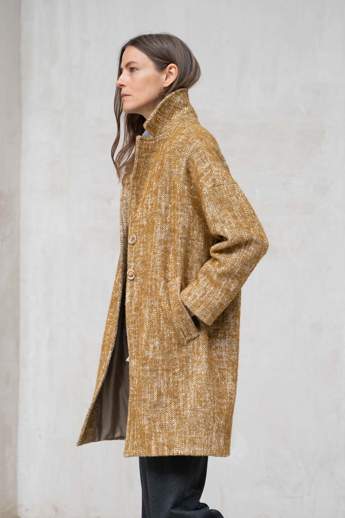 El abrigo Monza mostaza jaspeado es la prenda perfecta para quienes buscan un toque de color sofisticado en sus estilismos de invierno. Su tono cálido ilumina cualquier outfit, mientras que su diseño atemporal y tejido confortable garantizan abrigo y comodidad. Combínalo con prendas neutras para un contraste elegante o con tonos tierra para un look armonioso.