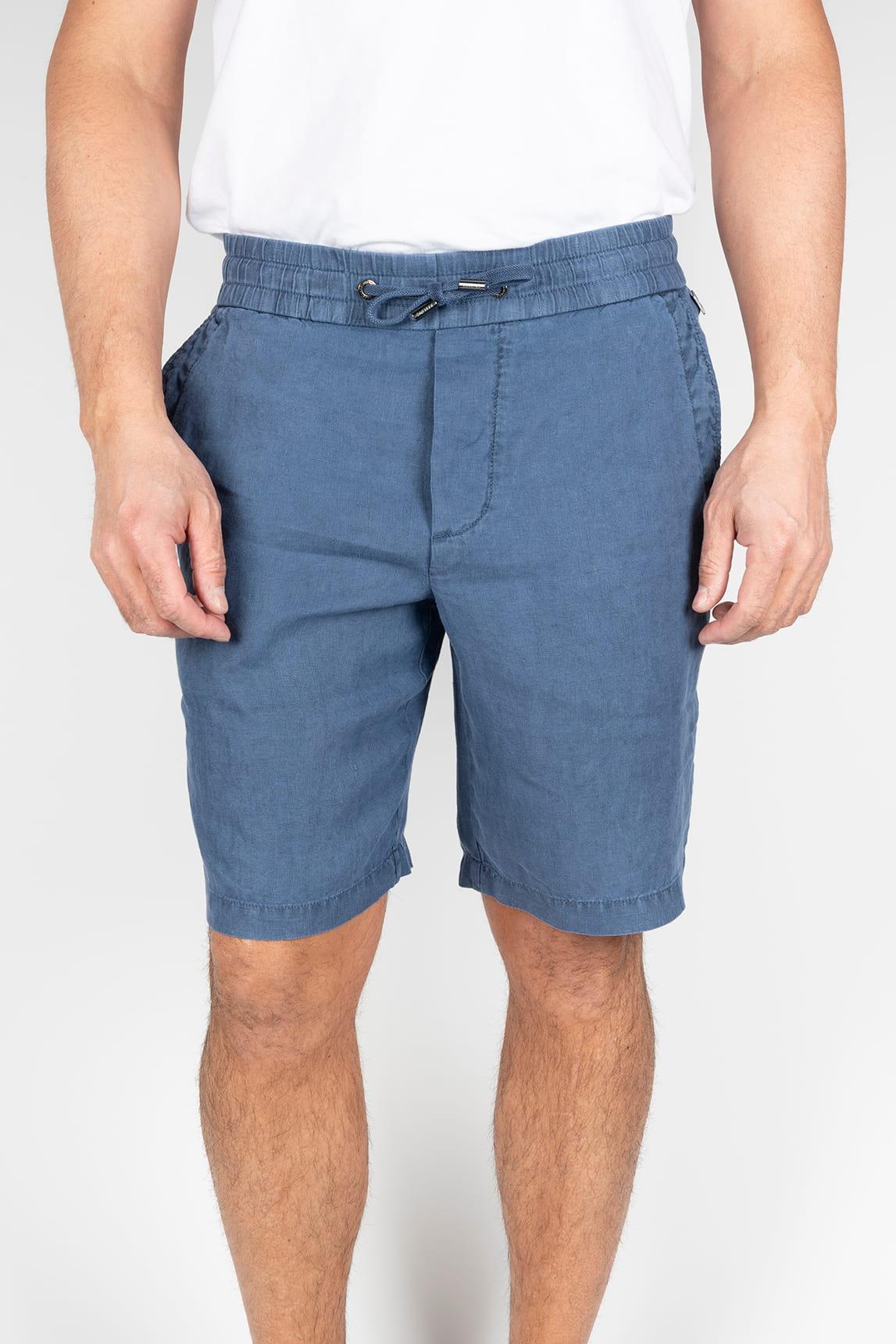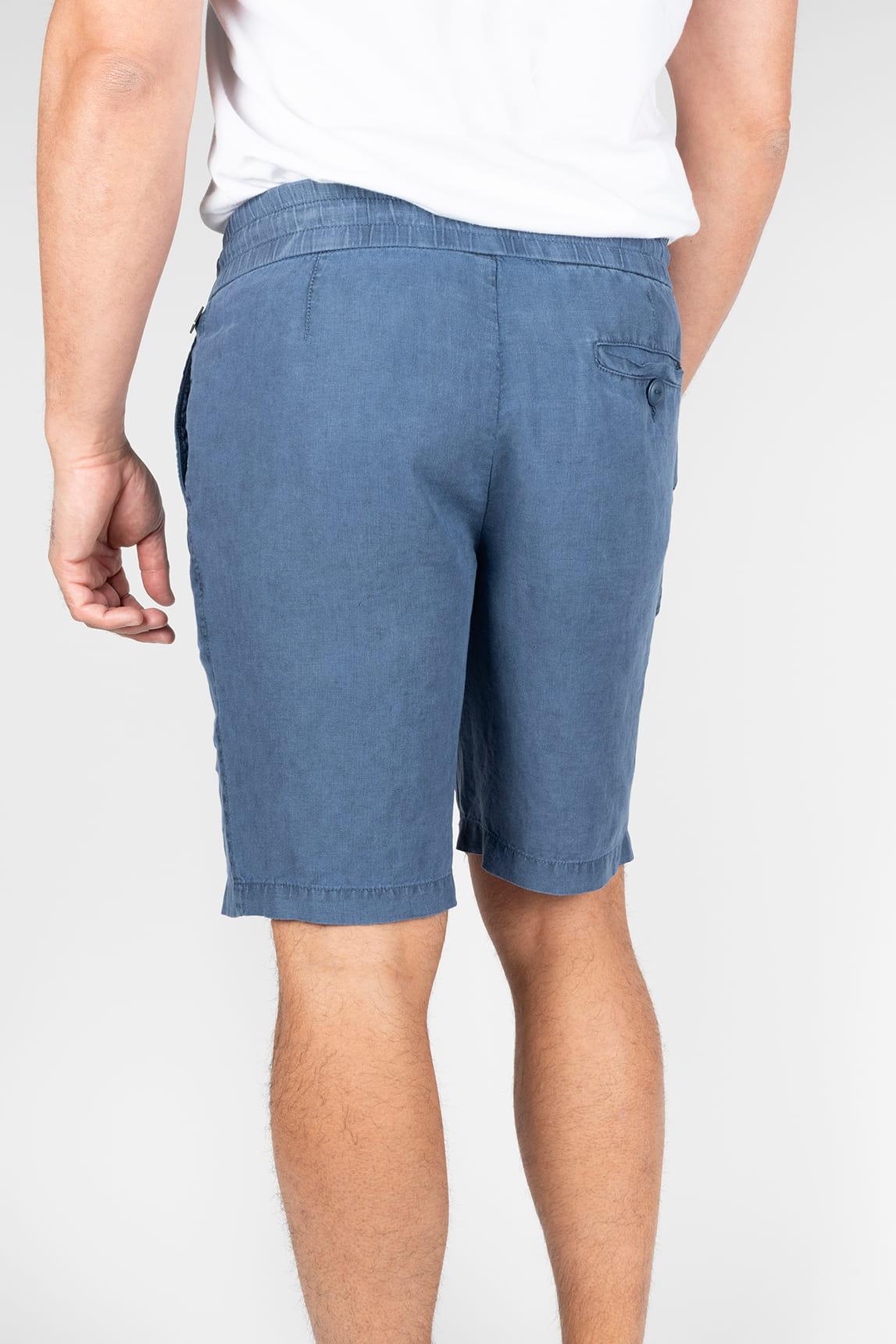 Esta bermuda en tono azul marino presenta una silueta limpia y equilibrada, con largo por encima de la rodilla y una caída recta que aporta naturalidad al movimiento. La cintura elástica con cordón ajustable se integra como elemento visible, reforzando su carácter práctico, mientras los bolsillos laterales y el frente depurado mantienen una estética ordenada. El tejido de apariencia ligera y textura suavemente lavada sugiere frescura, con un acabado uniforme que potencia su versatilidad.