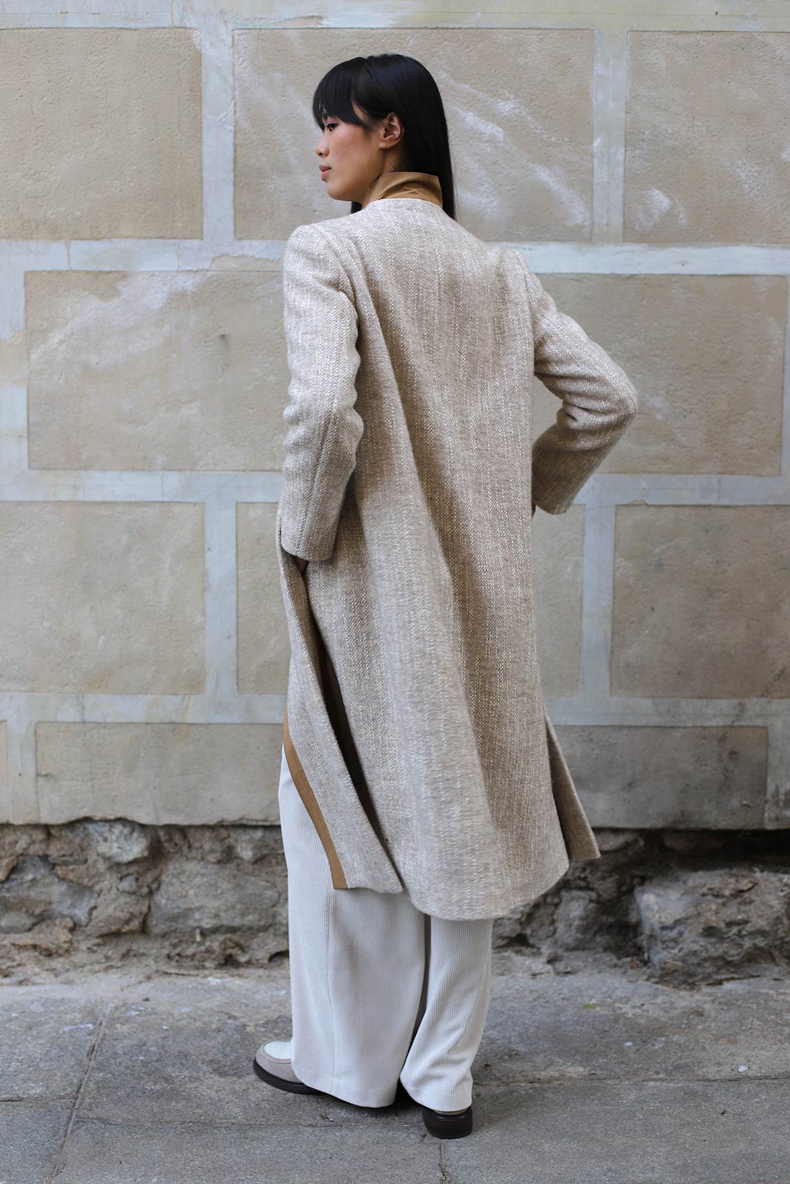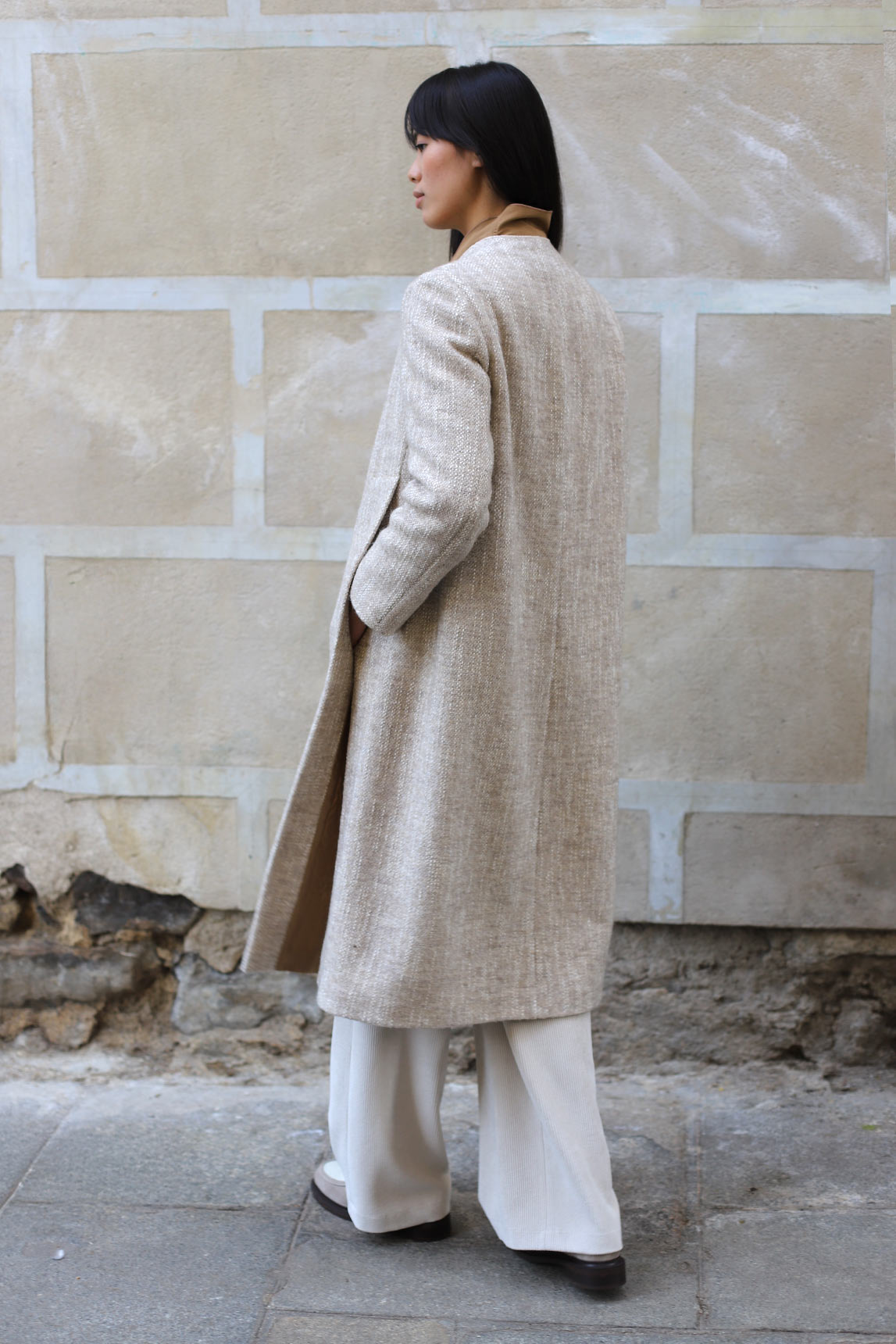 El abrigo Lotta de Rivera apuesta por la elegancia tranquila. Confeccionado en un tejido tipo tweed jaspeado en beige arena, presenta una vista frontal en camel que enmarca el escote en V y aporta un contraste sofisticado. Su silueta recta y limpia, con cierre de un botón y bolsillos discretos, estiliza sin esfuerzo y permite superponer desde tricot fino hasta americanas. Un abrigo versátil para el día a día, perfecto para oficina y looks urbanos con vaquero, vestido midi o sastre.
