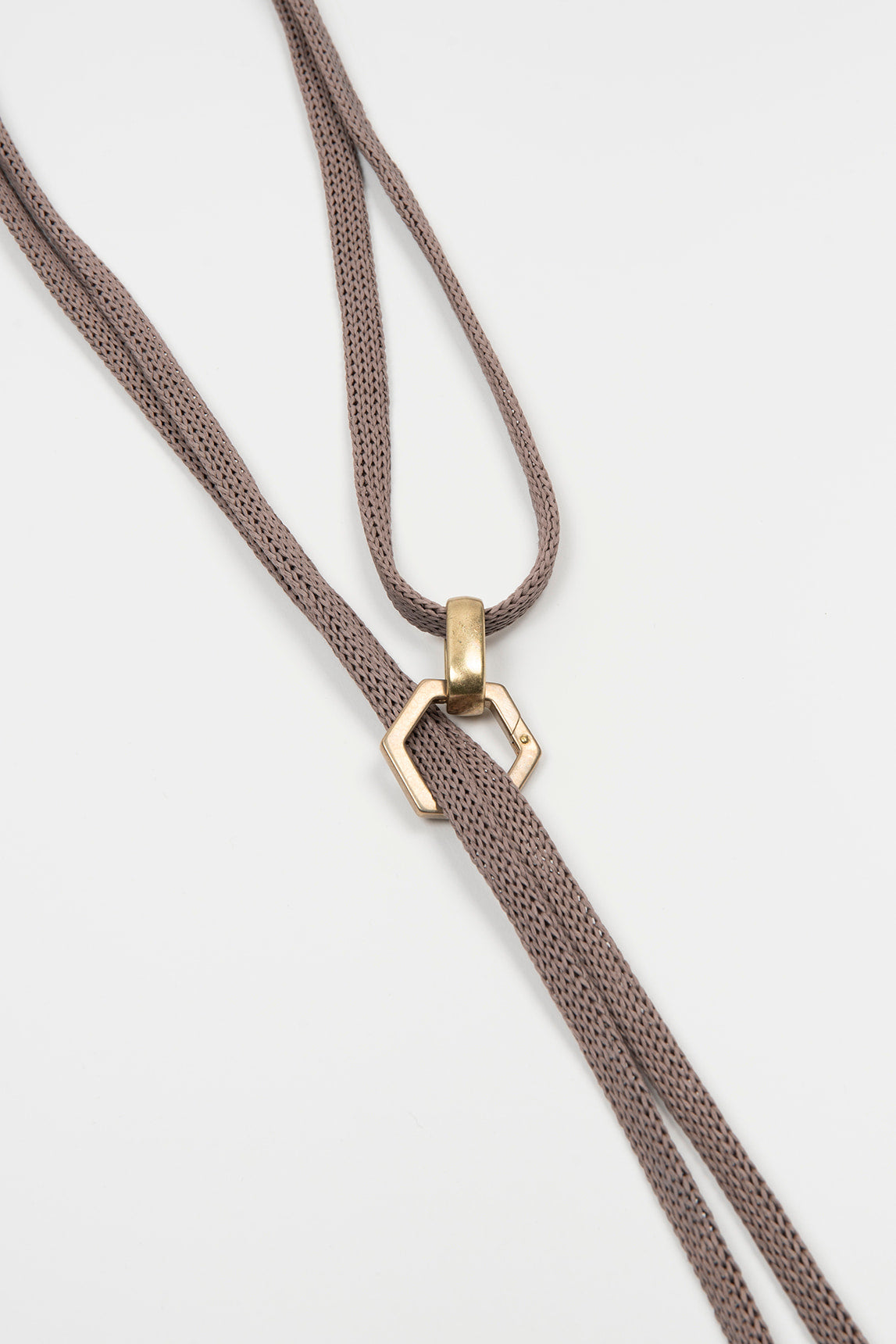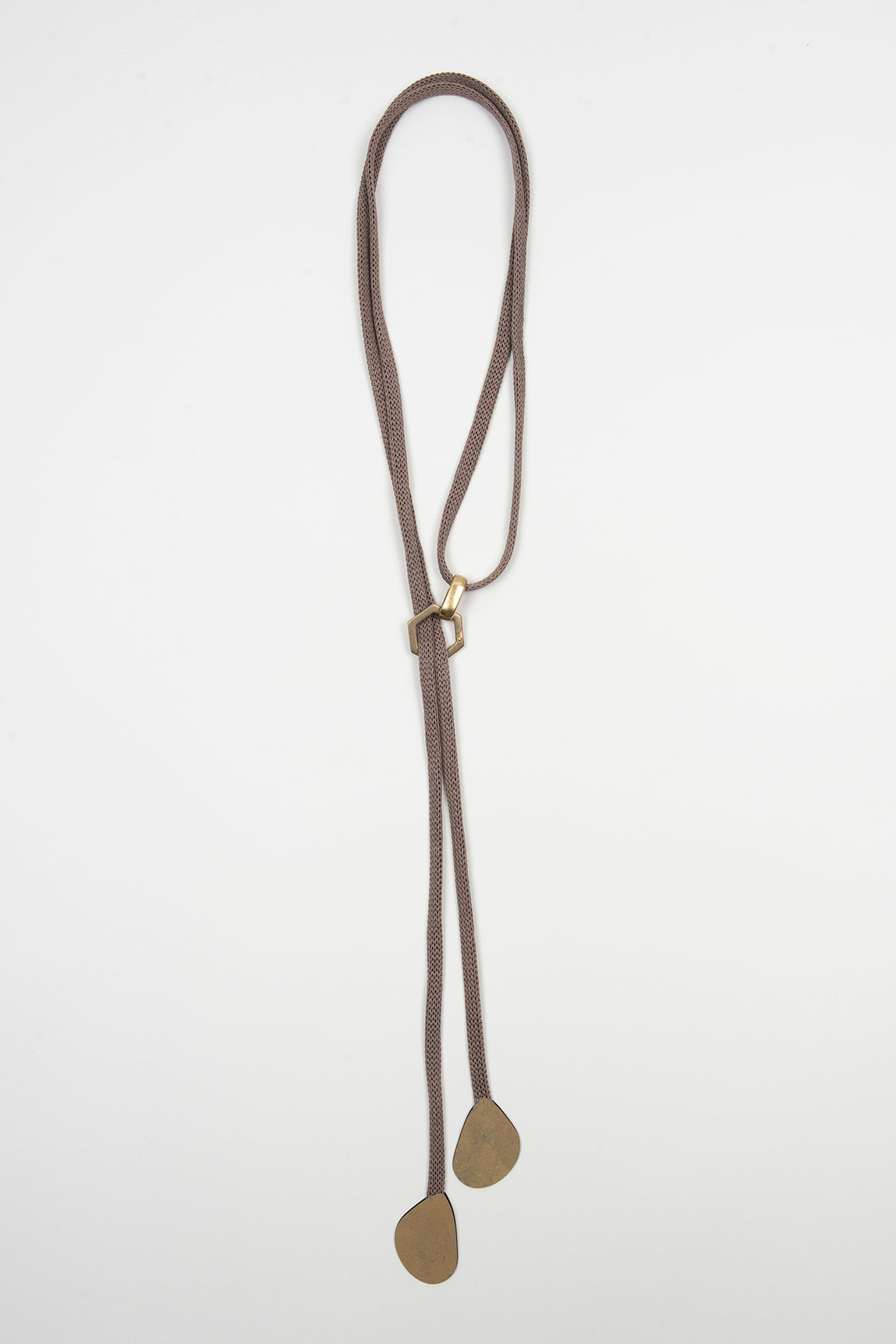 Este collar tipo lazo evoca el espíritu del clásico bolo tie con un toque contemporáneo y elegante. Está compuesto por un cordón marrón color topo de textura suave que permite ajustar la longitud a tu gusto. La pieza central metálica en forma de hexágono irregular añade un guiño geométrico al diseño, mientras que los terminales en forma de gota completan el conjunto con un aire orgánico y sobrio.