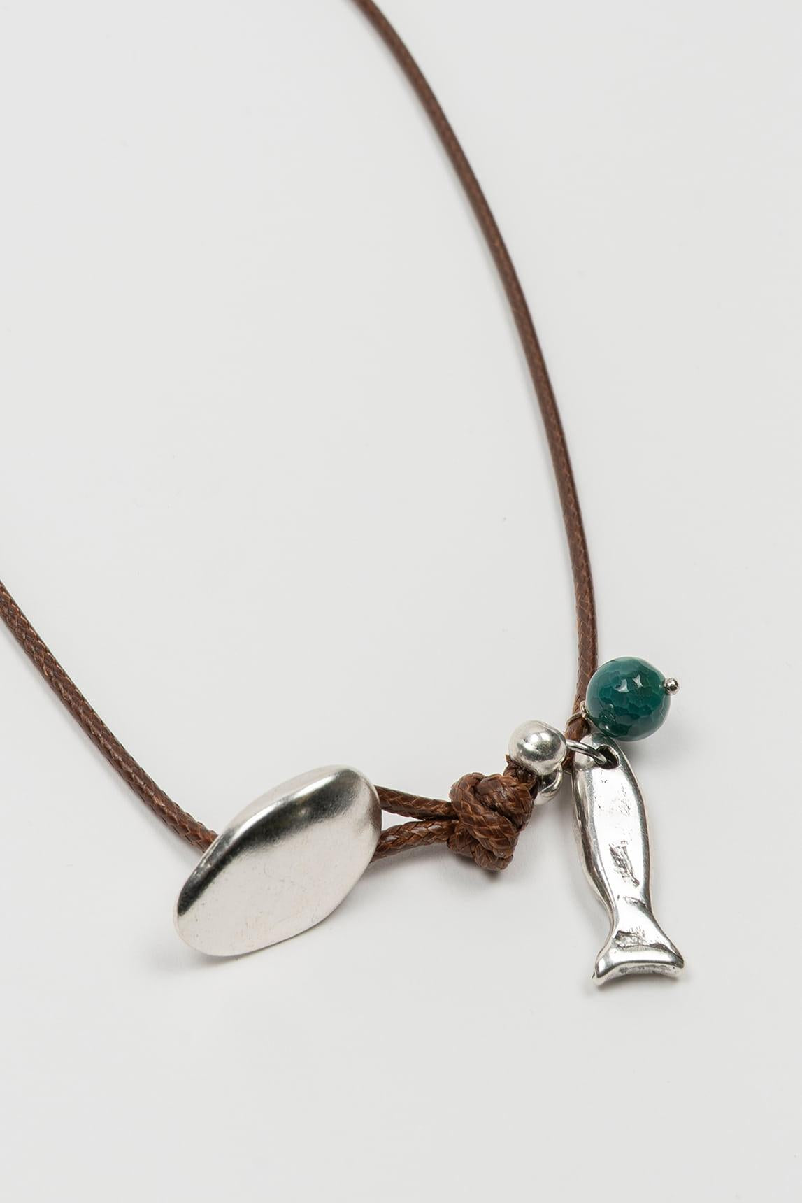 El collar Nerelia en plata mantiene la misma silueta fina y equilibrada, reinterpretada en un acabado más luminoso y contemporáneo. Su diseño incorpora pequeños charms metálicos y detalles decorativos que generan dinamismo sin recargar el conjunto.