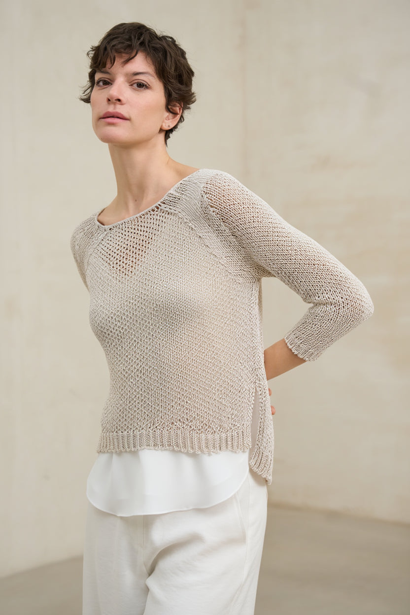 El jersey Évela piedra combina la ligereza del punto fino con un delicado trabajo calado en la parte superior que aporta textura y profundidad visual. Su tejido es sutilmente translúcido, generando un efecto ligero y etéreo; se recomienda llevarlo con top interior (no incluido), como el top Alenia blanco roto para un acabado natural y equilibrado.
