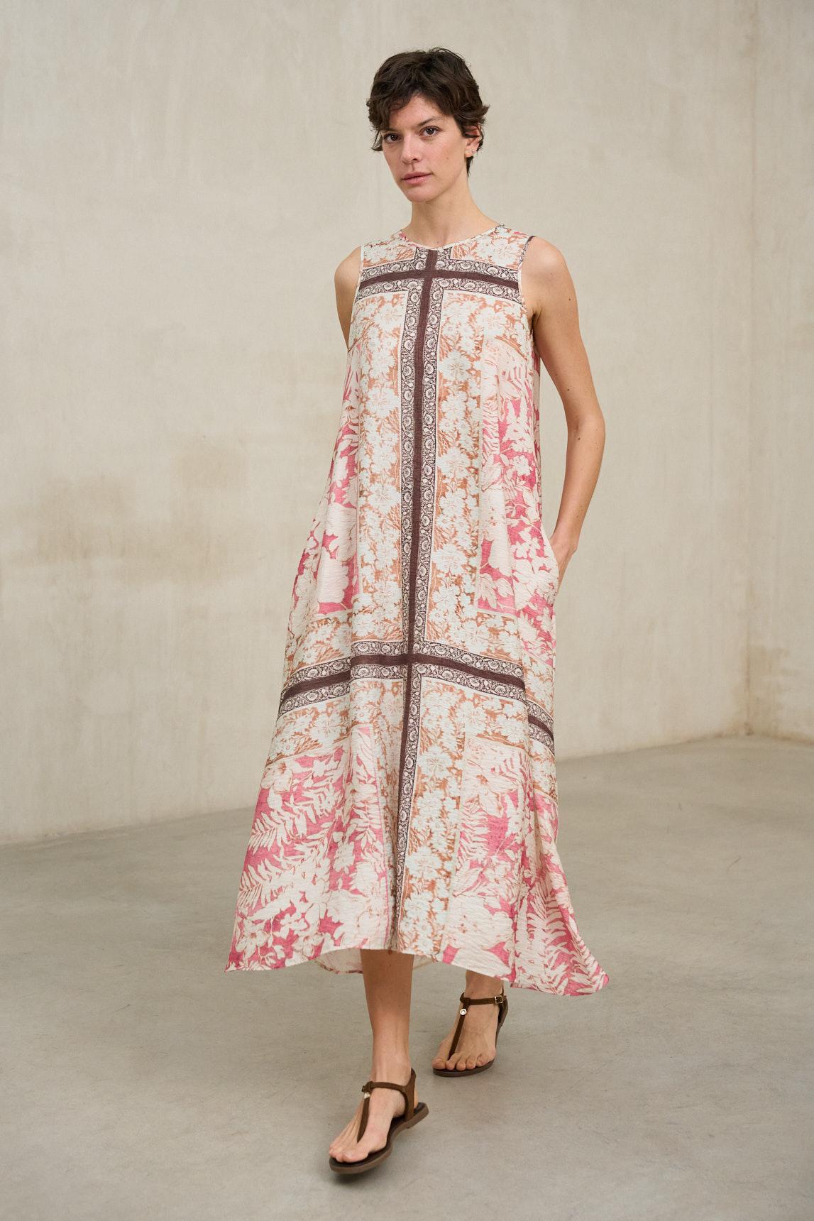 Marta 180 cm y lleva una talla 36. El vestido Arelia estampado coral es una pieza ligera y femenina que destaca por su silueta amplia y su delicado estampado floral en tonos coral sobre fondo claro. Su diseño sin mangas y escote redondo mantiene una línea limpia y favorecedora, ideal para los meses cálidos El detalle de las bandas verticales en contraste enmarca el estampado y aporta estructura visual al diseño, estilizando la figura sin restar fluidez. La caída evasé y el volumen suave del bajo generan movimiento natural al caminar, aportando dinamismo y ligereza. Es una prenda versátil que puede llevarse en clave relajada con sandalias planas o elevarse con accesorios más definidos para ocasiones especiales de verano. Una propuesta cómoda, fresca y con personalidad. Nos esforzamos por mostrar los colores de la forma más fiel posible, pero pueden variar ligeramente respecto a la realidad.