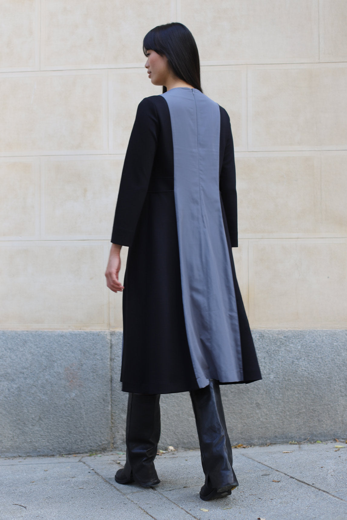 El contraste entre el punto negro y el panel técnico gris aporta un efecto óptico que alarga la figura y añade modernidad. El tejido técnico del centro es ligero y fácil de cuidar, ideal para un look de oficina pulido o eventos de día con botín o zapato plano.