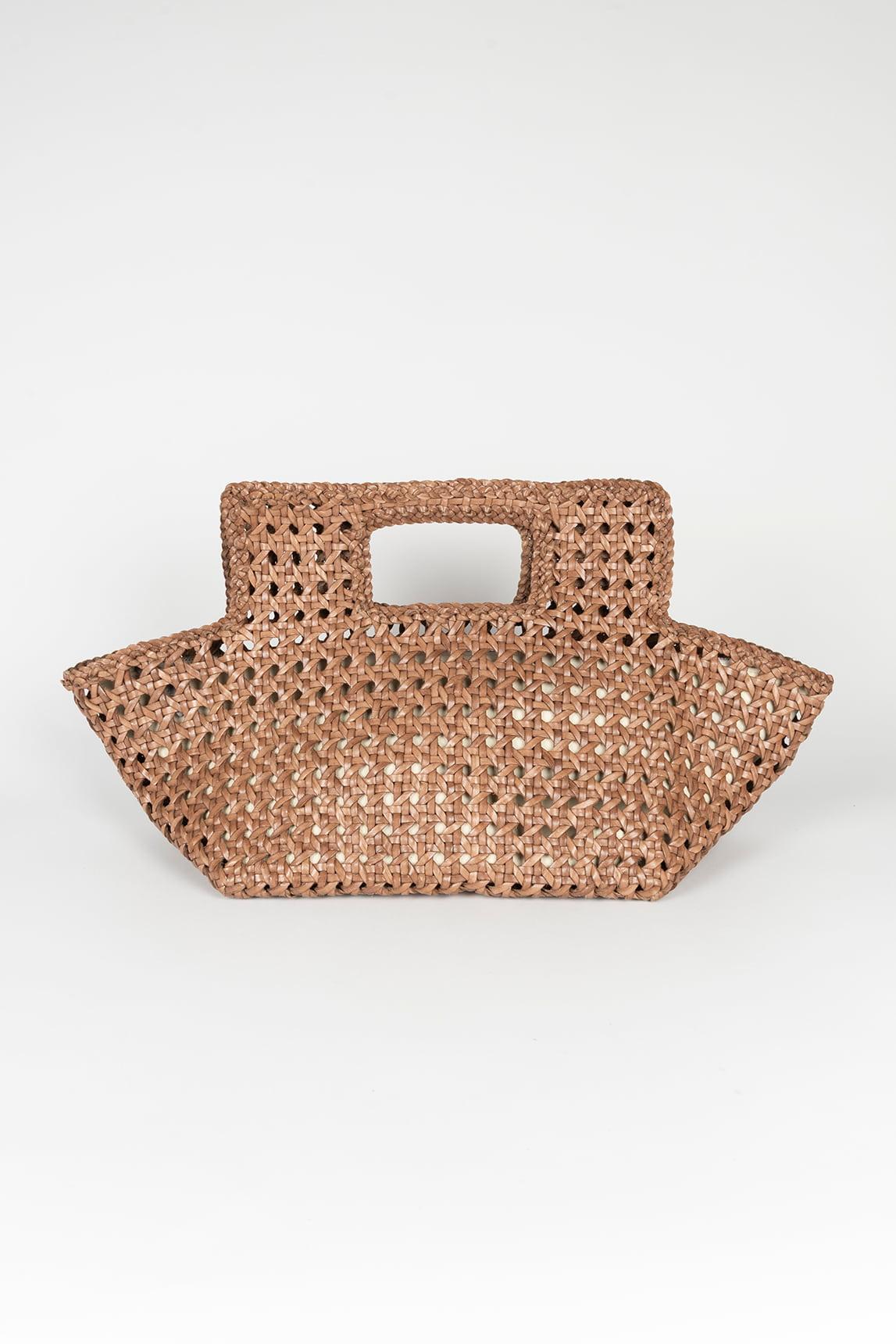 La piel trenzada aporta textura y profundidad visual, mientras que el tono camel ofrece una calidez atemporal que funciona en cualquier temporada. Su formato estructurado mantiene la forma y aporta presencia, sin resultar voluminoso ni pesado.