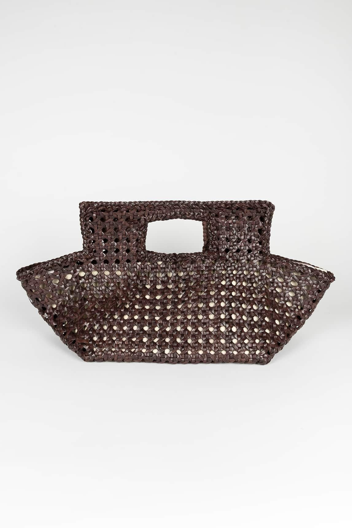 Confeccionado en piel trenzada artesanal, el acabado crea un juego de luces y sombras que intensifica la profundidad del tono chocolate. La estructura mantiene la forma sin rigidez excesiva, aportando presencia visual sin perder ligereza. Las asas integradas refuerzan su diseño limpio y arquitectónico.