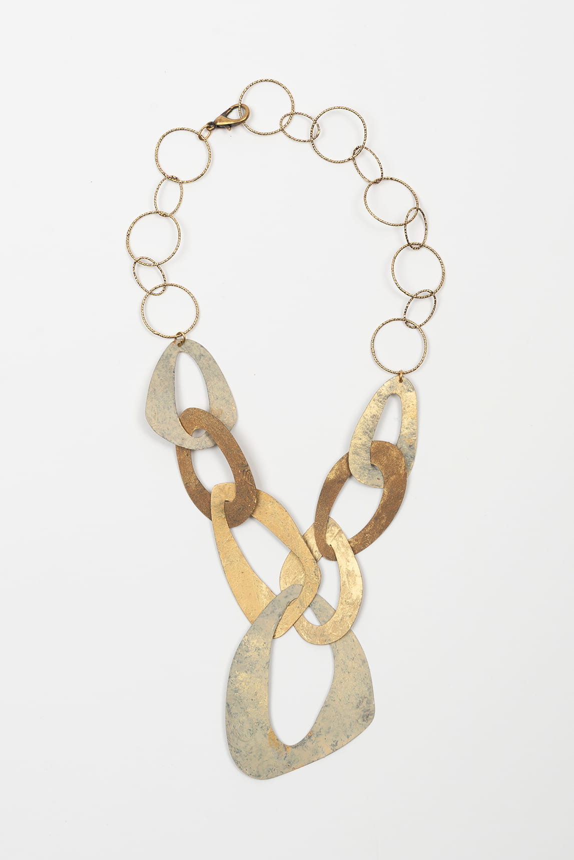 Short gold-tone chain necklace with wide, circular links. The front features a series of flat, organically shaped, irregular metal pieces with a two-tone finish (gold and antique silver) and a slightly mottled texture. It fastens at the top with a lobster clasp and ring.