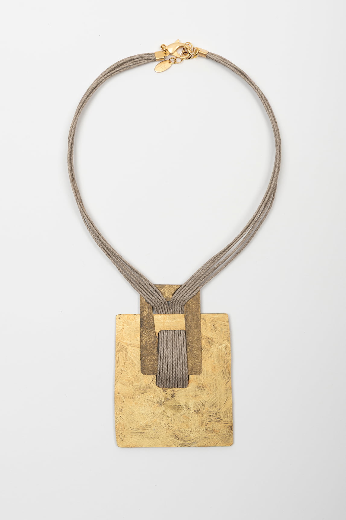 Multi-strand gray necklace with a short-to-medium drop, finished with a large square pendant in a gold-tone finish with an irregular texture. The top section gathers into a central piece that organizes the strands and creates a clean, layered effect, while the metal clasp with extender allows for comfortable adjustment at the neckline.