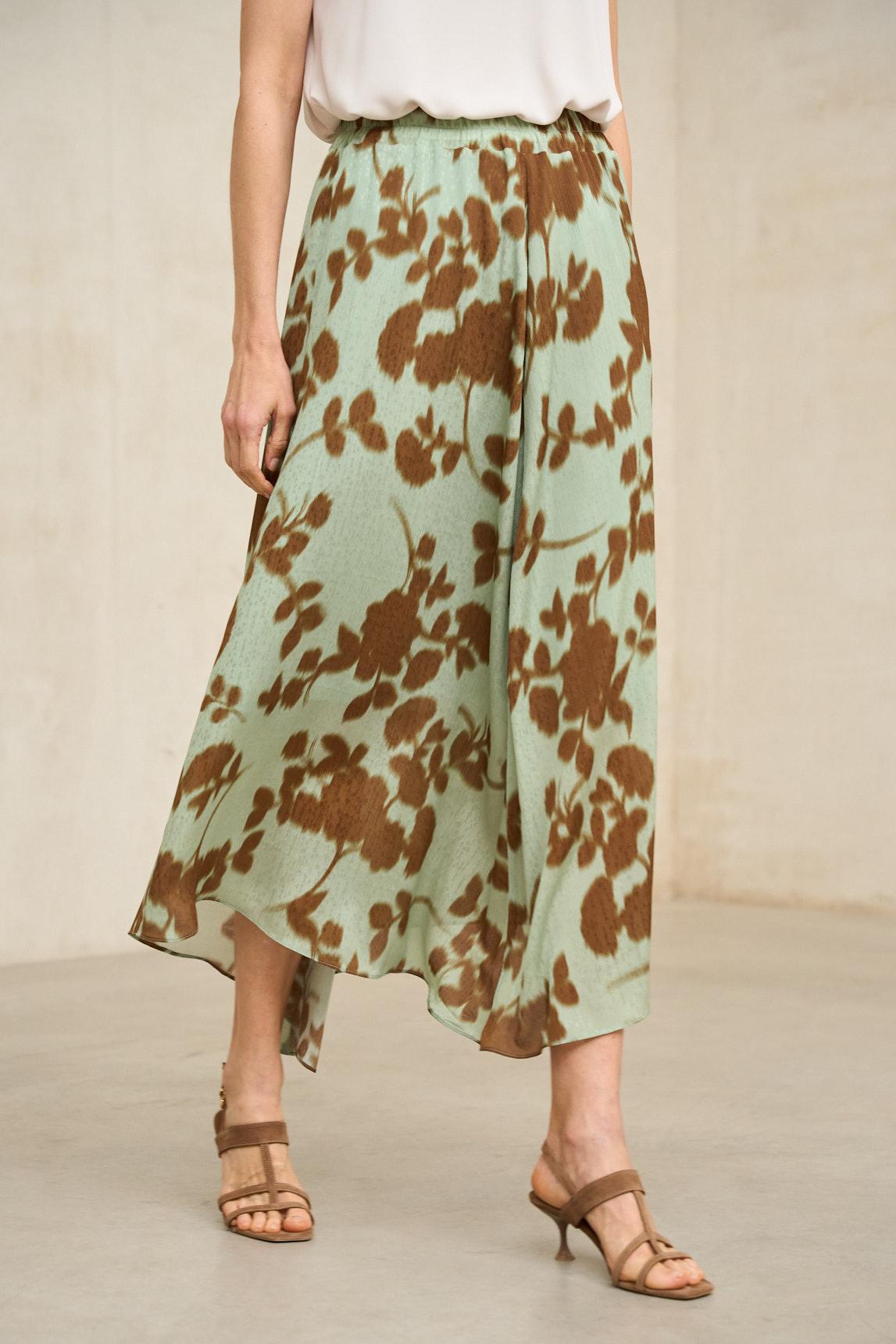 Falda midi confeccionada en tejido ligero con movimiento fluido y caída natural. Presenta diseño asimétrico con picos irregulares que aportan dinamismo y ligereza visual. El estampado en tonos verdes y matices neutros crea un contraste equilibrado y fresco.