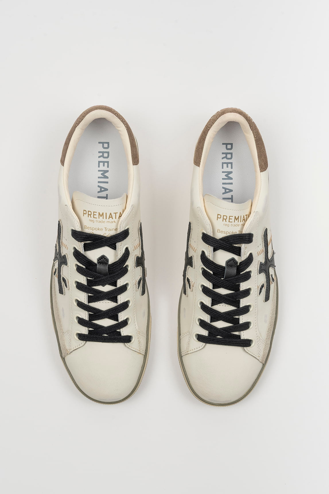 Las Steven 7630 de Premiata apuestan por la sencillez premium: piel suave en blanco, logo negro y toques neutros que combinan con todo. Perfectas para looks casual con vaqueros, chinos o sastrería relajada.