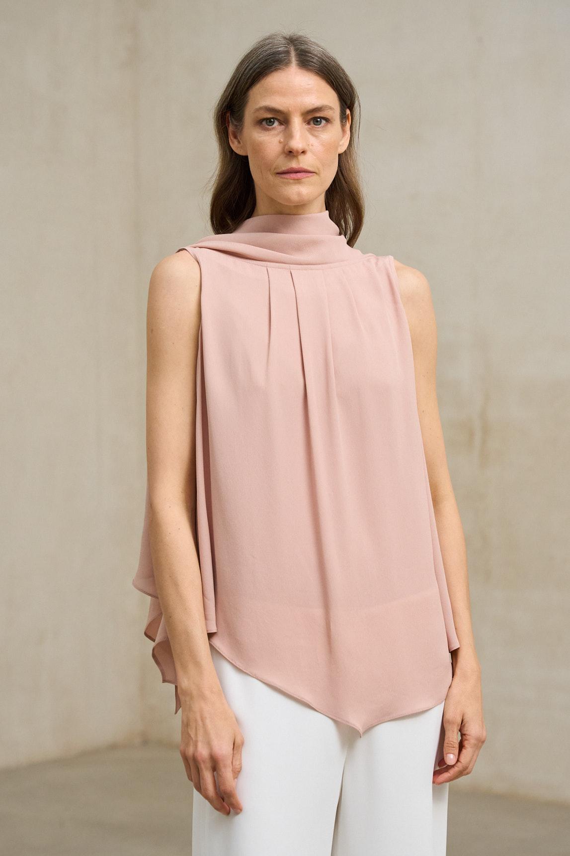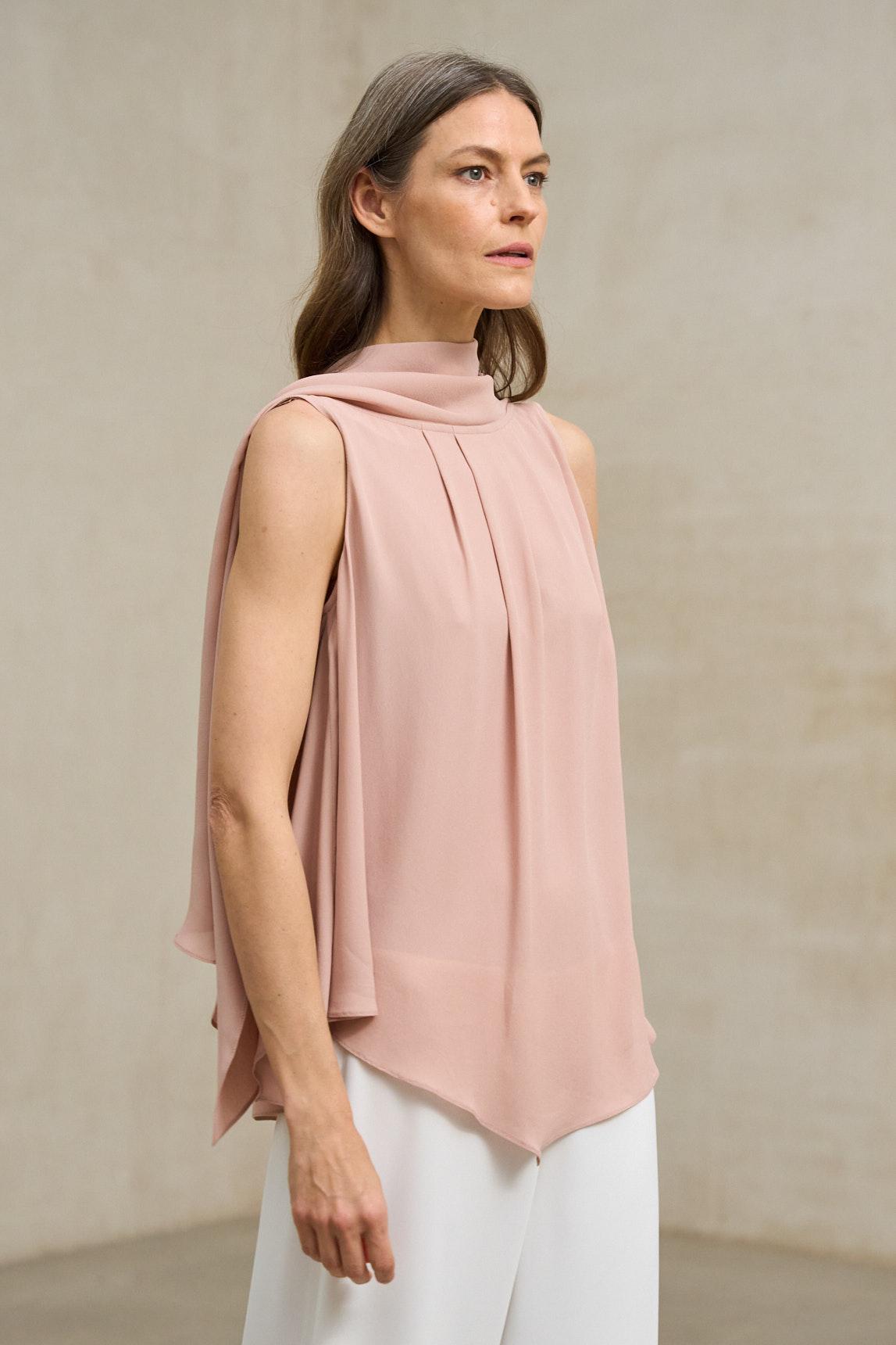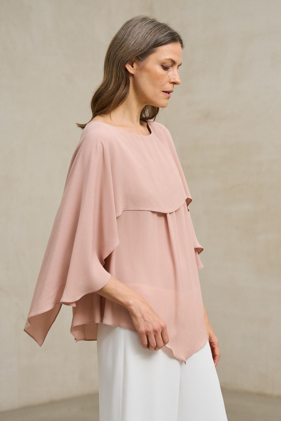 A blusa Tamara em rosa antigo é uma peça fluida e sofisticada que se destaca pelo seu design descontraído e silhueta envelope. Confecionada em tecido leve e com um caimento suave, apresenta um decote em bico e mangas largas estilo capa que conferem movimento e um toque contemporâneo ao look. O seu design incorpora uma camada frontal sobreposta que cria volume e profundidade visual, afinando a silhueta sem apertar demasiado. O delicado e luminoso tom rosa-pó acrescenta um toque feminino e elegante que suaviza o look sem diminuir a sua presença. A blusa Tamara em rosa antigo é ideal para eventos como batizados ou celebrações, bem como para looks mais descontraídos quando combinada com calças fluídas em tons de cru, bege ou areia. Uma peça versátil que equilibra leveza, design e sofisticação natural. Esforçamo-nos por exibir as cores da forma mais precisa possível, mas podem variar ligeiramente da realidade.