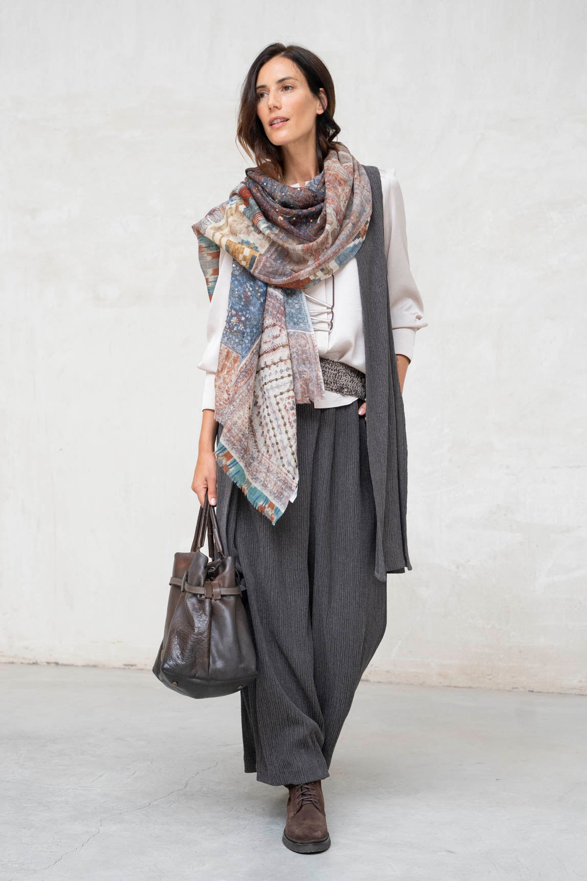 O lenço Rivera Patchwork é uma peça especial com um estampado artístico de patchwork em tons quentes e terra. Confecionado em lã e seda, é adornado com delicados toques de fios metálicos, missangas e pequenos apliques brilhantes, criando um efeito subtil de luz e sofisticação. A sua textura macia e fluida permite que seja utilizado de diversas formas. Uma peça versátil e distinta, ideal para dar um toque único aos seus looks de outono ou inverno.