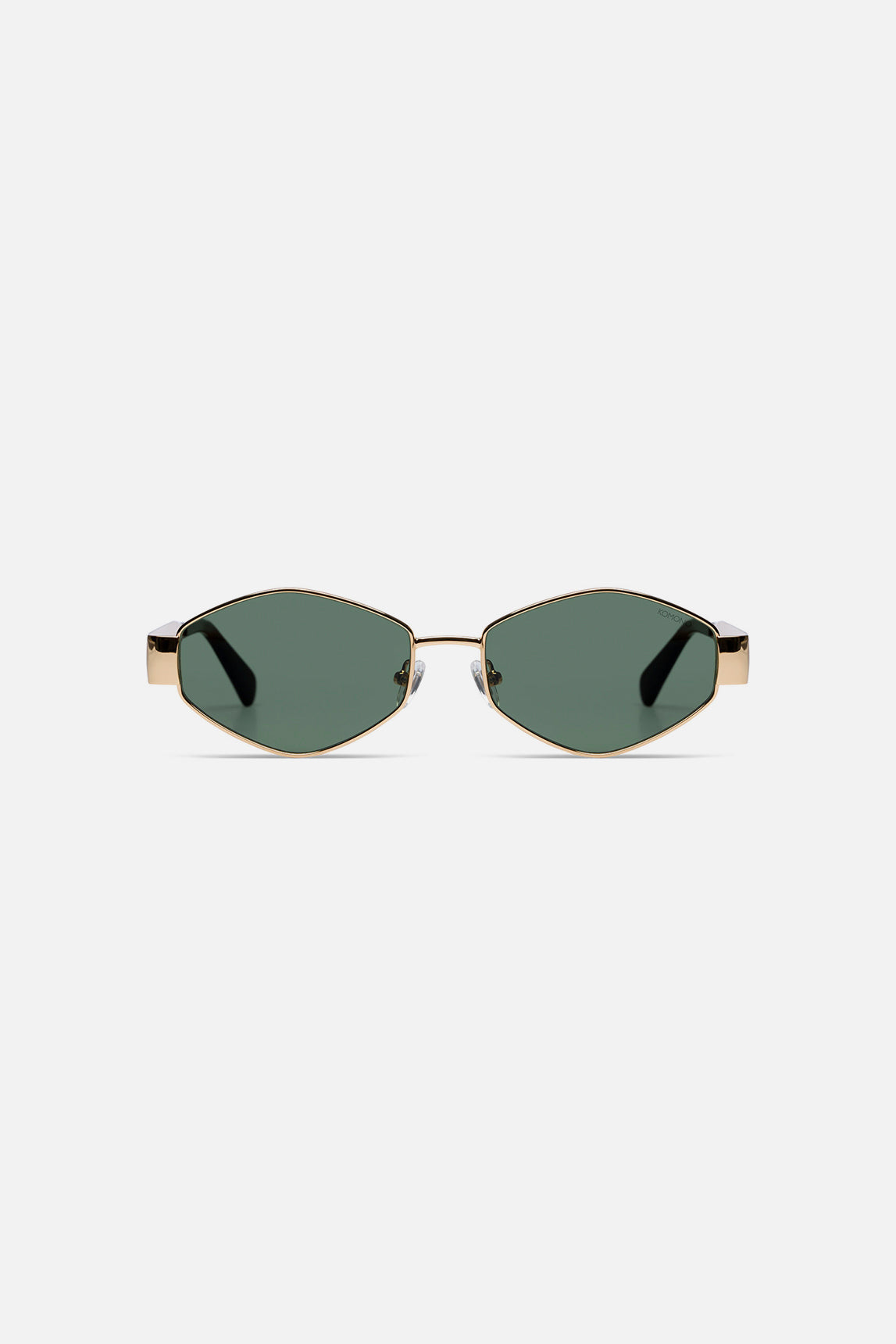 Os óculos de sol Komono Fenix ​​Gold combinam um design minimalista com materiais de alta qualidade. A sua armação em aço inoxidável proporciona leveza e durabilidade, enquanto as lentes verdes oferecem uma proteção UV400 eficaz contra os raios solares. Um modelo versátil e sofisticado, perfeito para complementar looks urbanos ou mais elegantes com um toque moderno.