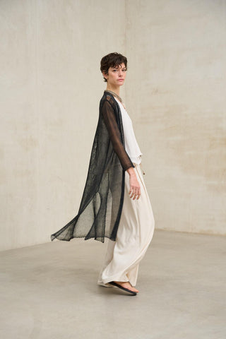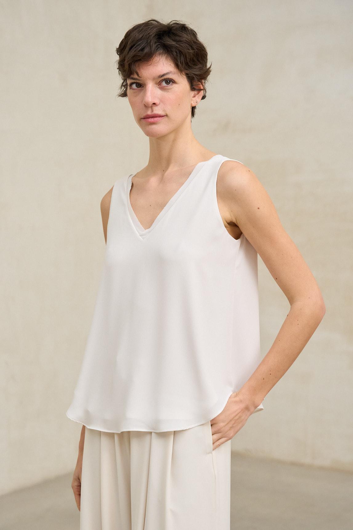 Este top sin mangas presenta una silueta amplia y ligera, definida por un escote en pico tanto en el delantero como en la espalda, que estiliza la parte superior y aporta una línea limpia y equilibrada. El tejido ofrece una caída fluida y continua, con un acabado liso que potencia la sensación de suavidad y movimiento. El bajo ligeramente redondeado refuerza su carácter relajado, mientras que el corte suelto permite que la prenda acompañe el cuerpo sin ajustarse.