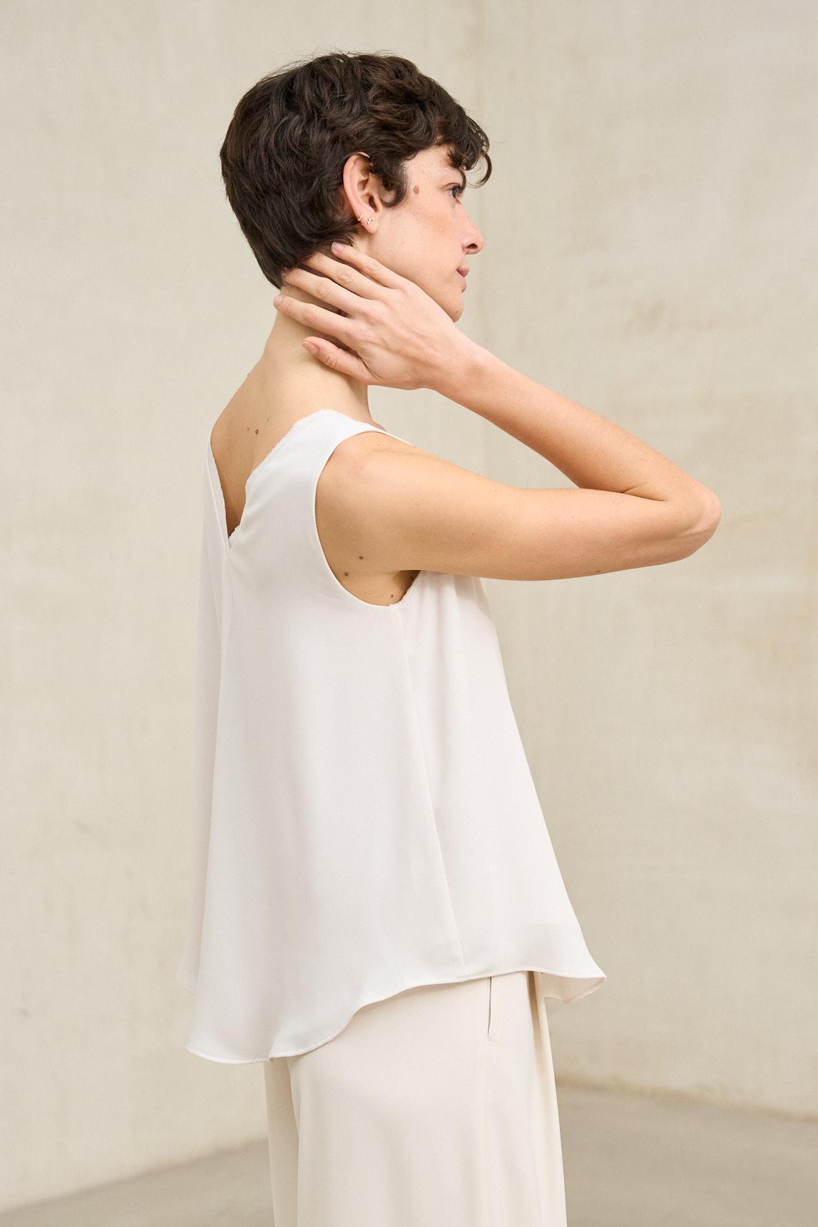En clave cromática, el blanco roto introduce una tonalidad intermedia entre el blanco óptico y el crudo: más suave que el primero y más neutra que el segundo. Este matiz aporta profundidad sutil y una luminosidad más templada, ideal para estilismos en gama clara o combinaciones con arena, topo, negro o verde salvia. Minimalista y versátil, el Top Inès blanco roto funciona como base depurada tanto en looks cotidianos como en propuestas más pulidas. Transmite frescura refinada y equilibrio, convirtiéndose en una pieza esencial para construir conjuntos serenos y contemporáneos.