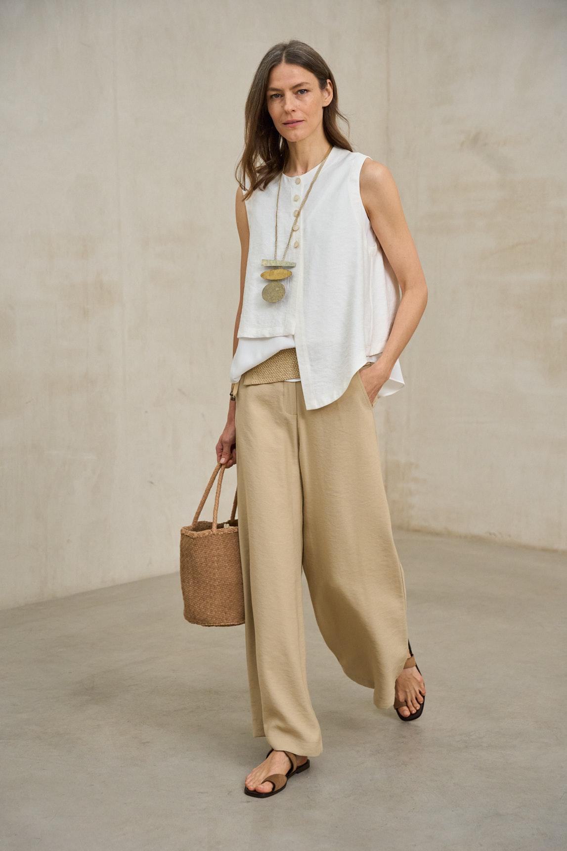 Colete de menina confecionado em tecido texturizado naturalmente. O modelo sem mangas apresenta gola redonda, fecho frontal com botões na mesma cor e bolsos aplicados para maior praticidade. O corte solto e a bainha assimétrica criam uma silhueta fluida e elegante. O colete branco Freja é uma peça versátil que combina conforto e elegância descontraída. Ideal para usar por cima de camisas ou blusas leves, adapta-se tanto a looks urbanos como a estilos mais naturais e artesanais. O seu tom neutro permite que seja facilmente incorporado em produções de primavera com um toque contemporâneo. Esforçamo-nos por exibir as cores da forma mais precisa possível, mas podem variar ligeiramente da realidade.