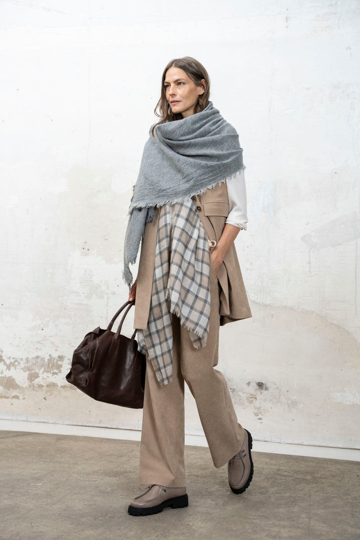 A calça Cheryl da Rivera é a peça chave dos seus looks de outono e inverno. Confeccionada em tecido de textura macia e versátil cor cinza, essa calça oferece elegância e conforto em cada uso. Seus bolsos, fecho de correr e presilhas para cinto acrescentam um toque funcional e moderno. O corte reto valoriza a silhueta e facilita a combinação com qualquer peça de roupa.