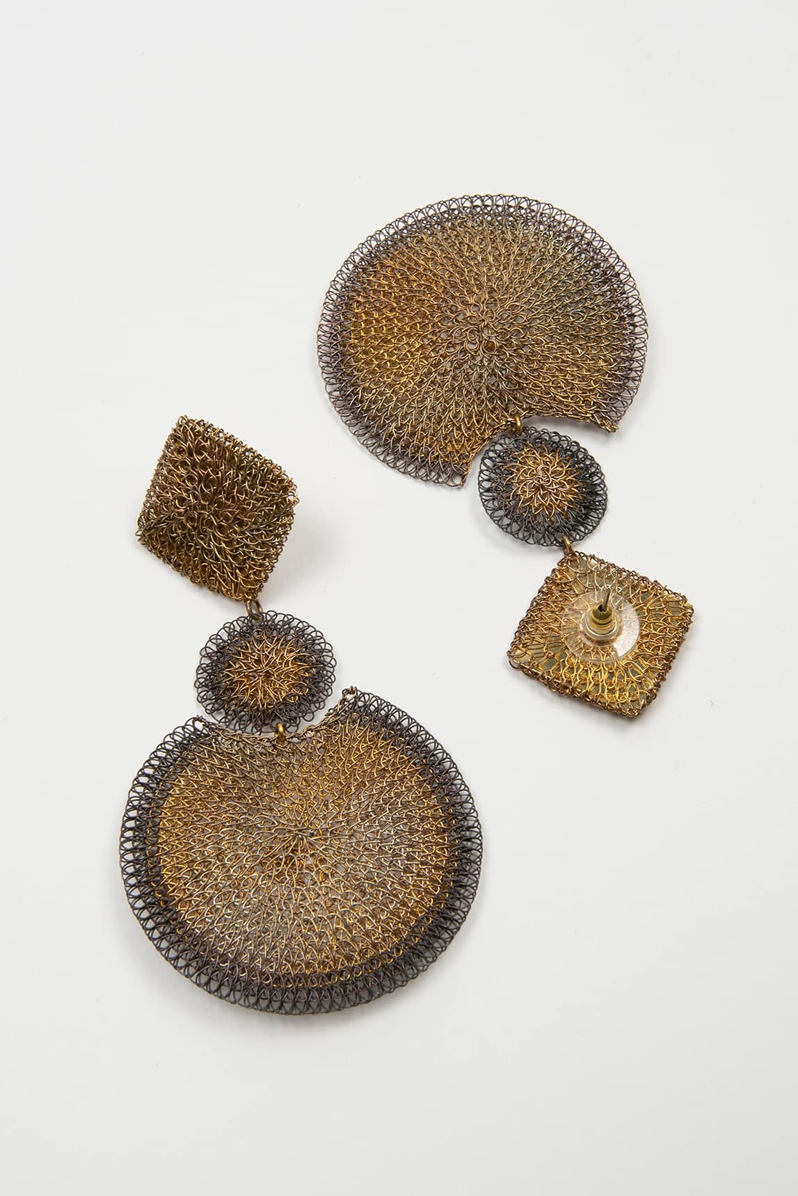- Brincos geométricos em malha metálica com efeito bicolor em dourado e cinzento envelhecido.