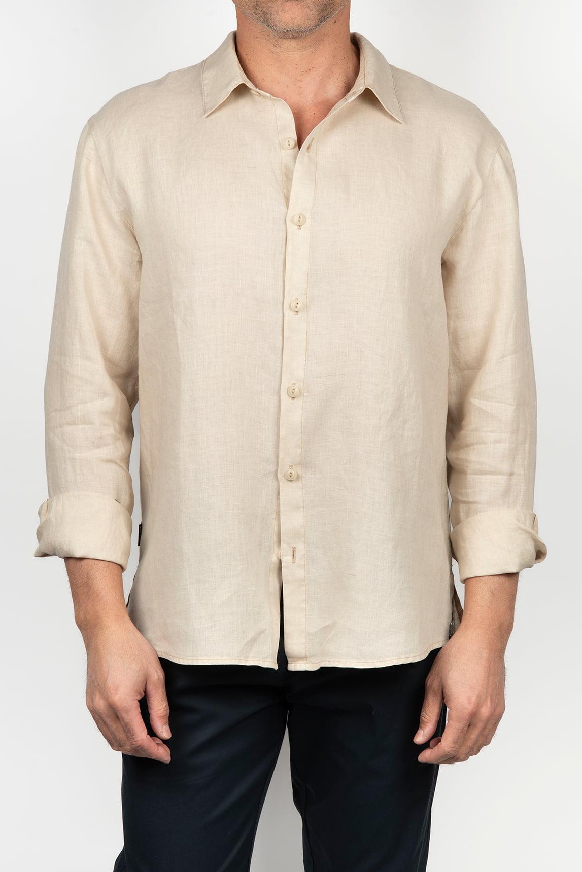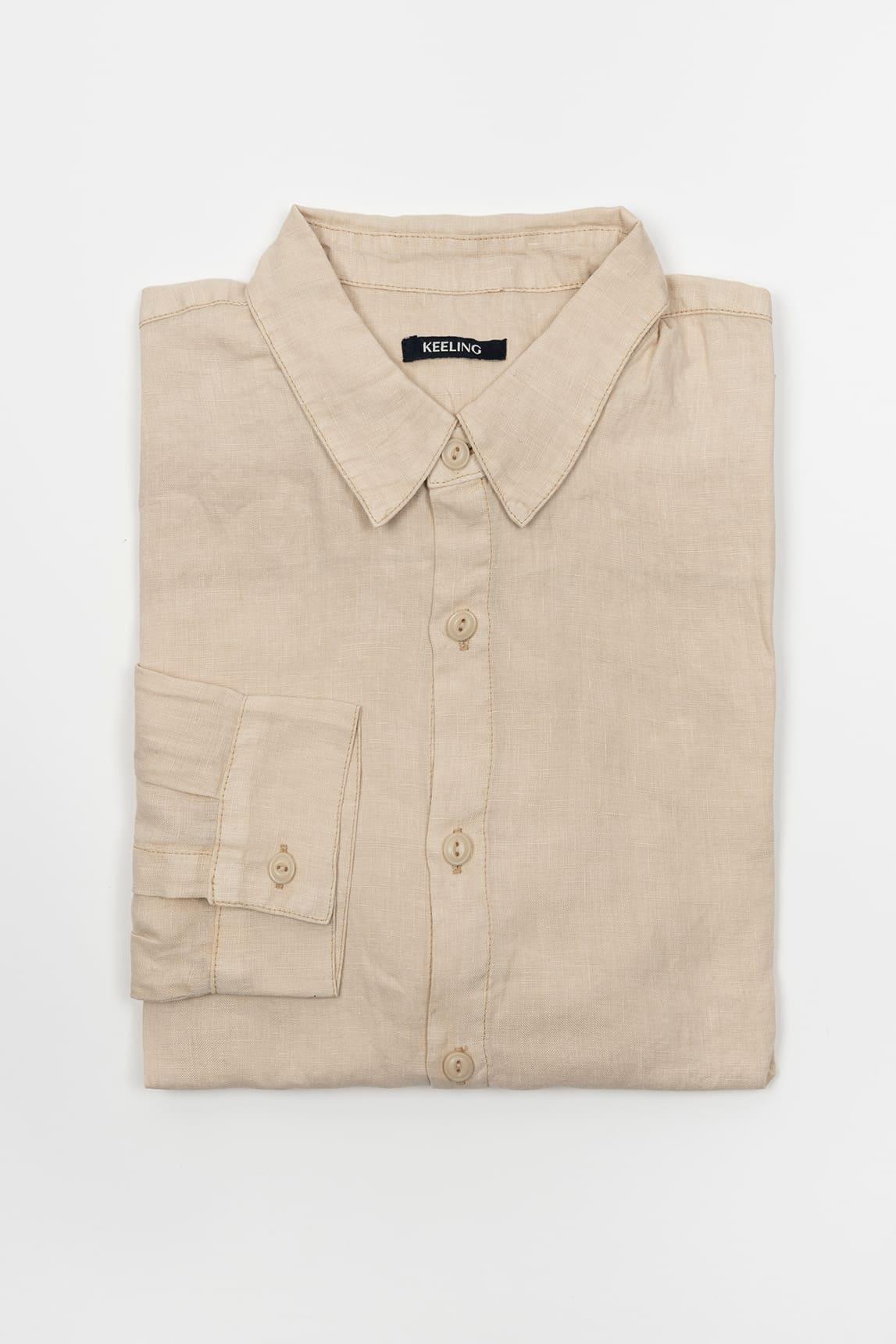 Men's long-sleeved shirt in a beige tone, with a straight silhouette and clean lines. It features a classic collar, front button closure in the same tone, and buttoned cuffs, with a soft-looking surface and a washed finish that adds chromatic depth without detracting from the design's simplicity. The structure feels lightweight, promoting a natural drape and a relaxed yet well-ordered look.