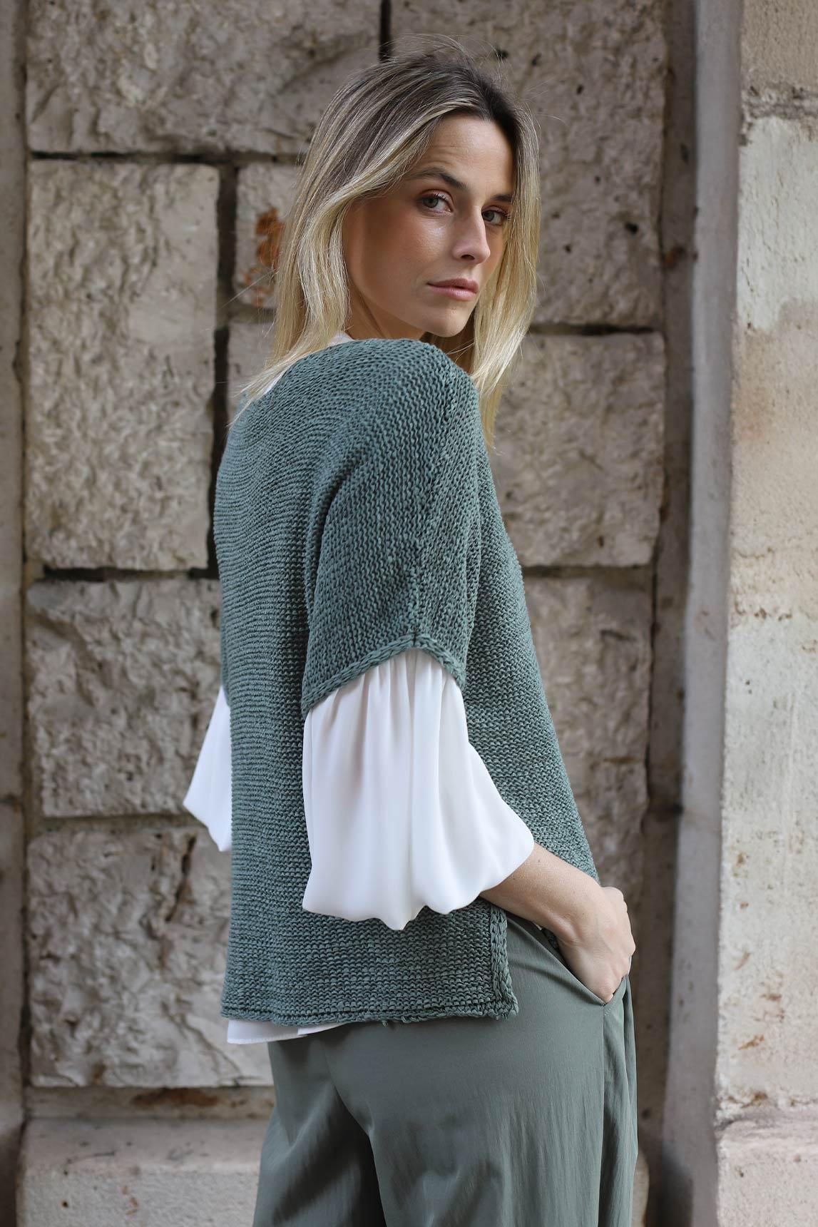 The sage tone provides a natural and serene nuance, easy to combine with neutral tones such as sand, beige, ecru, or white. A timeless garment that fits perfectly into a wardrobe designed to accompany you season after season.