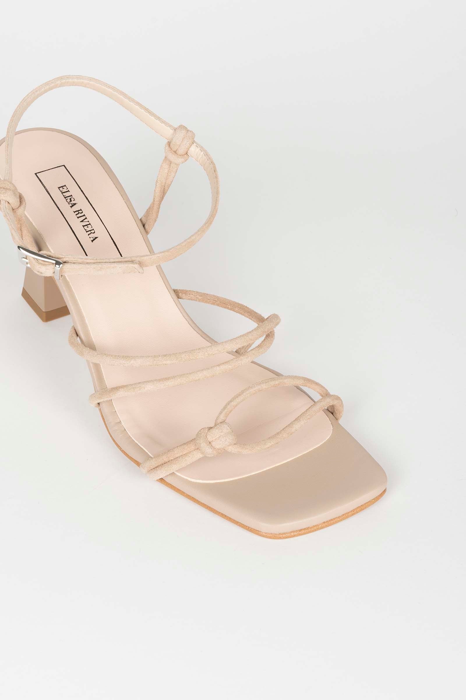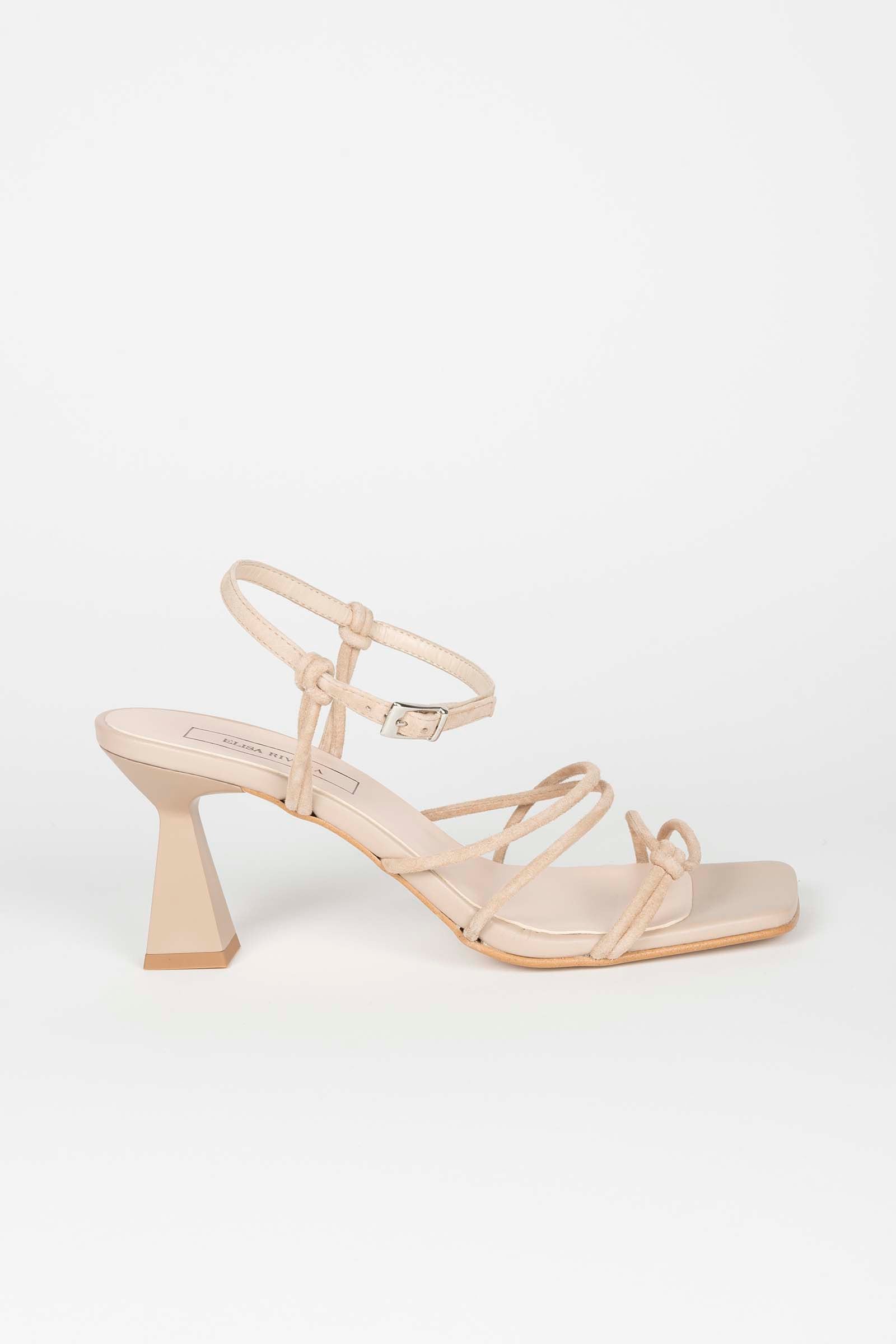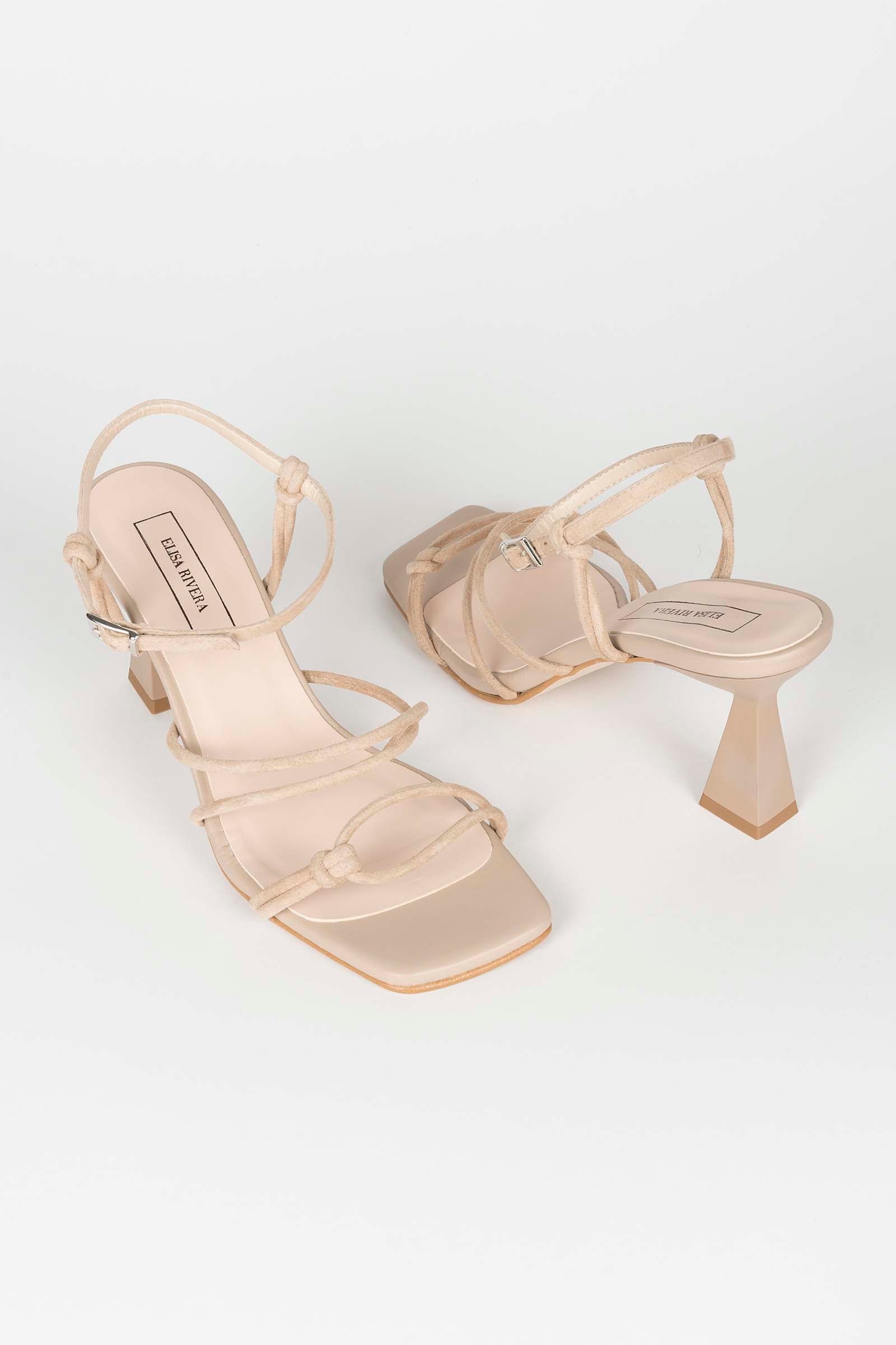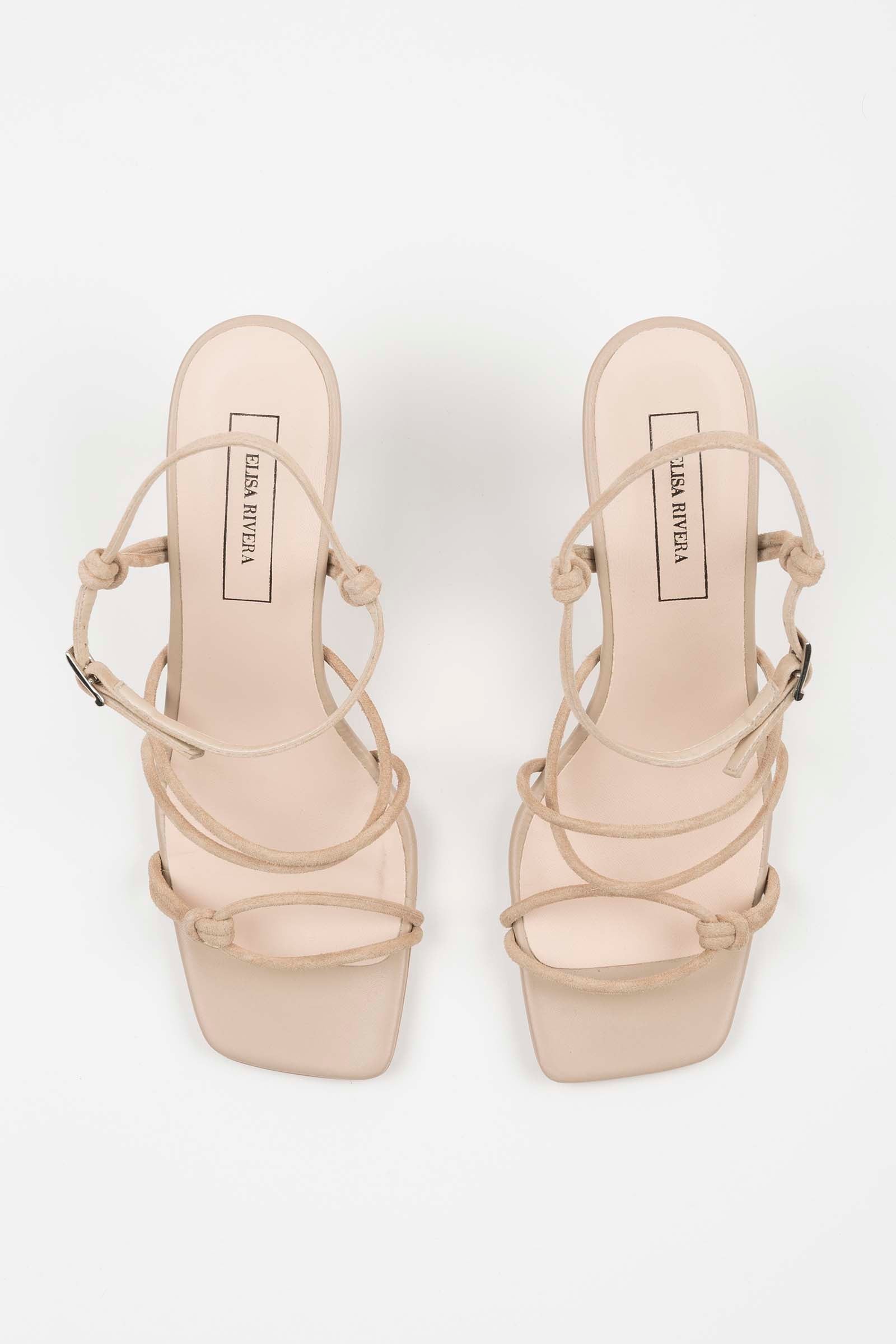 Desfrute de elegância e exclusividade com nossas sandálias de salto Elise bege. Apresentam um design sofisticado com tiras com nós, duas tiras de camurça entrelaçadas no peito do pé e um fecho de tira para maior suporte. Feitas 100% em camurça e desenhadas em Madri. Combine-as com nosso look de primavera/verão.
