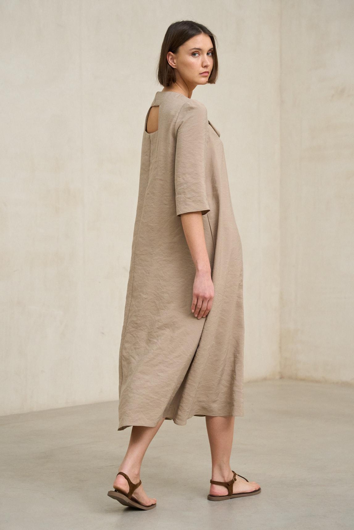 The Lurien Mole Dress is a piece with soft lines and a wide silhouette that stands out for its relaxed elegance. Made from a lightweight fabric with a natural drape, it features a rounded neckline and wide elbow-length sleeves that add movement and comfort.