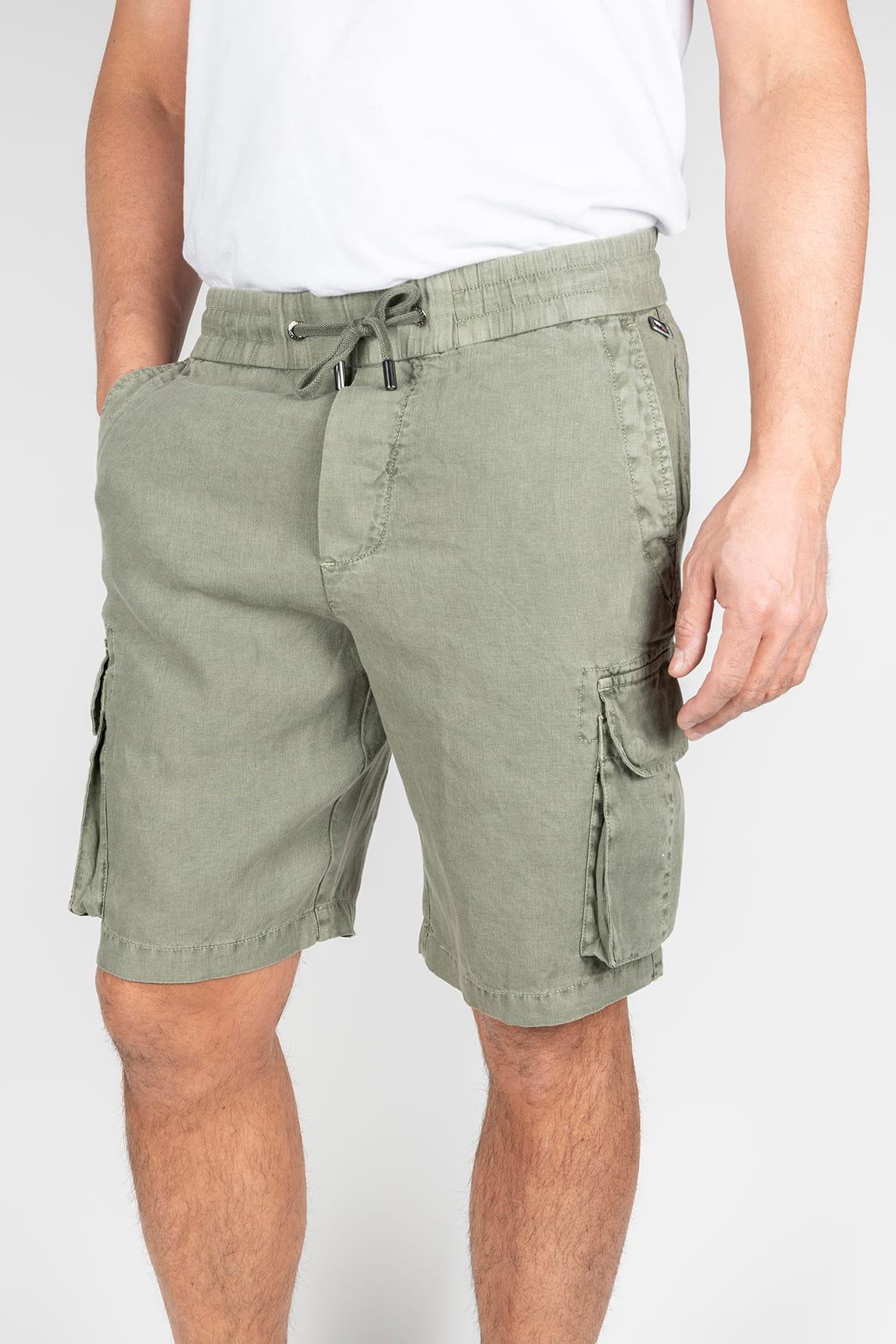 Esta bermuda en tono caqui presenta una estética utilitaria con carácter relajado, con largo por encima de la rodilla y una silueta recta que favorece la comodidad. La cintura elástica con cordón ajustable se muestra como un elemento funcional visible, mientras los bolsillos laterales y los bolsillos tipo cargo en la pernera refuerzan su identidad práctica. El tejido de apariencia ligera y textura suavemente lavada aporta una caída natural, acompañando el movimiento con soltura.