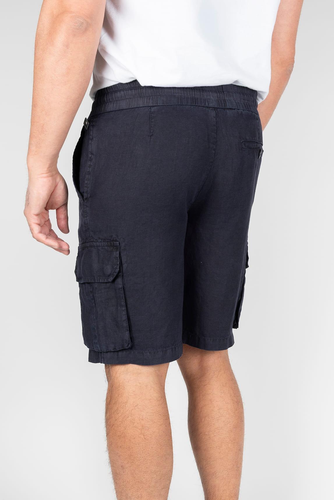 Esta bermuda en tono azul marino presenta una estética más profunda y definida, con largo por encima de la rodilla y una silueta recta que aporta equilibrio visual. La cintura elástica con cordón ajustable se mantiene como un elemento protagonista, reforzando su funcionalidad, mientras los bolsillos laterales y el bolsillo tipo cargo en la pernera añaden un matiz utilitario claramente visible. El tejido de aspecto ligero y textura natural ofrece una caída suave que acompaña el movimiento con soltura.