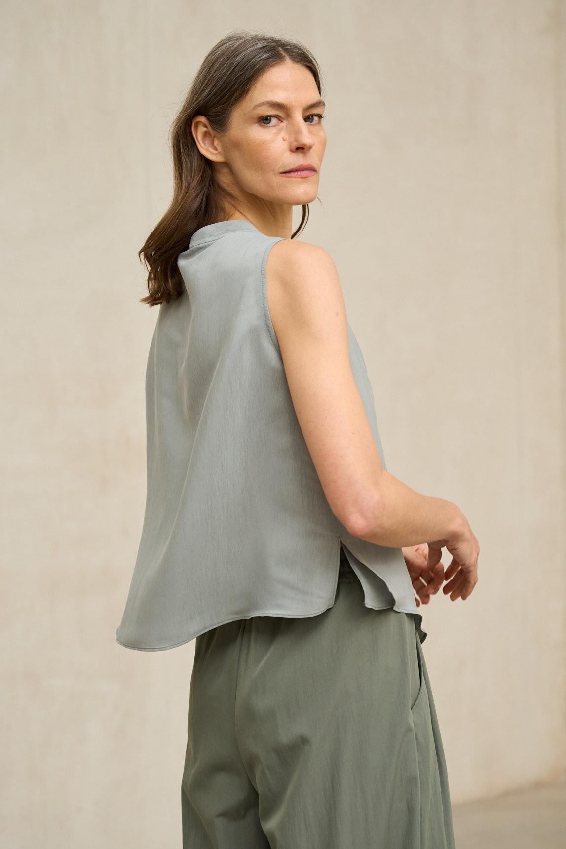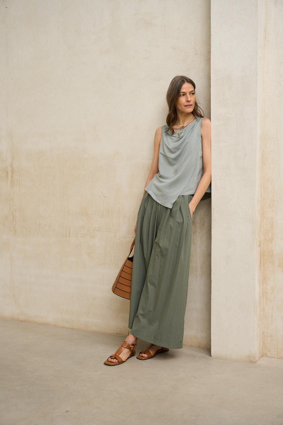 La Blusa Nireya gris azulado mantiene la silueta fluida y el escote delicadamente drapeado que define el modelo. Su tejido ligero aporta movimiento y una sensación de ligereza que favorece un ajuste natural y cómodo. El escote con caída suave crea un efecto elegante y relajado, aportando textura visual sin recargar el diseño. El tono gris azulado introduce frescura y serenidad, integrándose fácilmente en estilismos con blancos, arena, crudos o marrones suaves. Su corte sin mangas equilibra el volumen del escote y permite superponerla bajo chaquetas ligeras o llevarla como pieza protagonista en los meses más cálidos. Una blusa femenina, atemporal y fácil de combinar que aporta sofisticación sin esfuerzo. Nos esforzamos por mostrar los colores de la forma más fiel posible, pero pueden variar ligeramente respecto a la realidad.