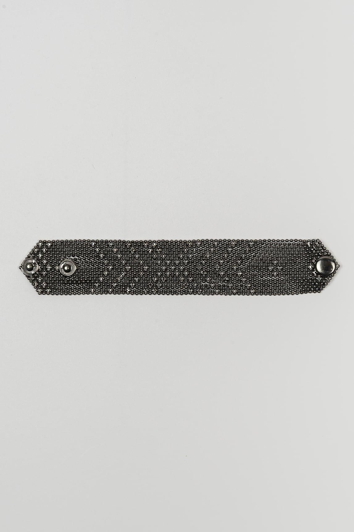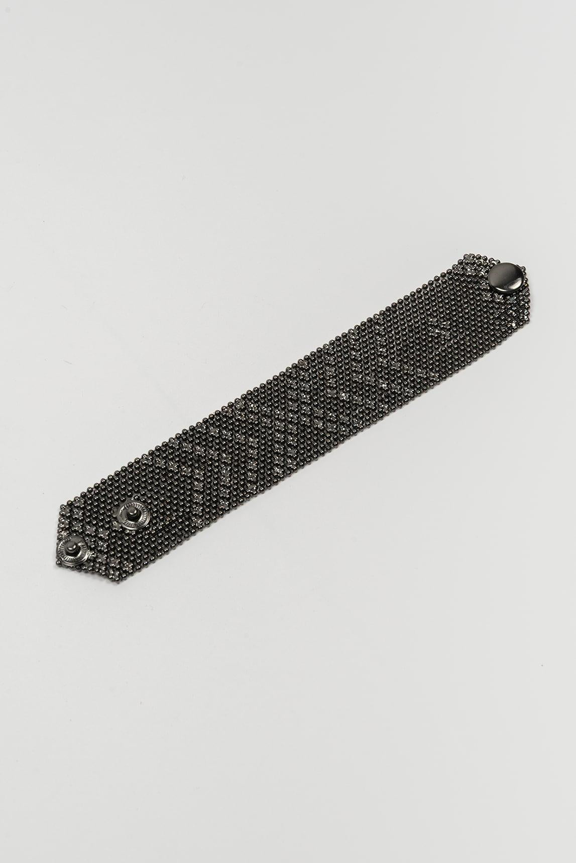Women's bracelet in an anthracite finish with a wide design and an openwork surface inspired by geometric patterns. The piece features a flat, elongated structure with a striking visual presence, while the perforated design adds texture, depth, and a very modern decorative effect. The dark tone of the metal reinforces a sober and contemporary aesthetic, balancing character and sophistication in a single piece.