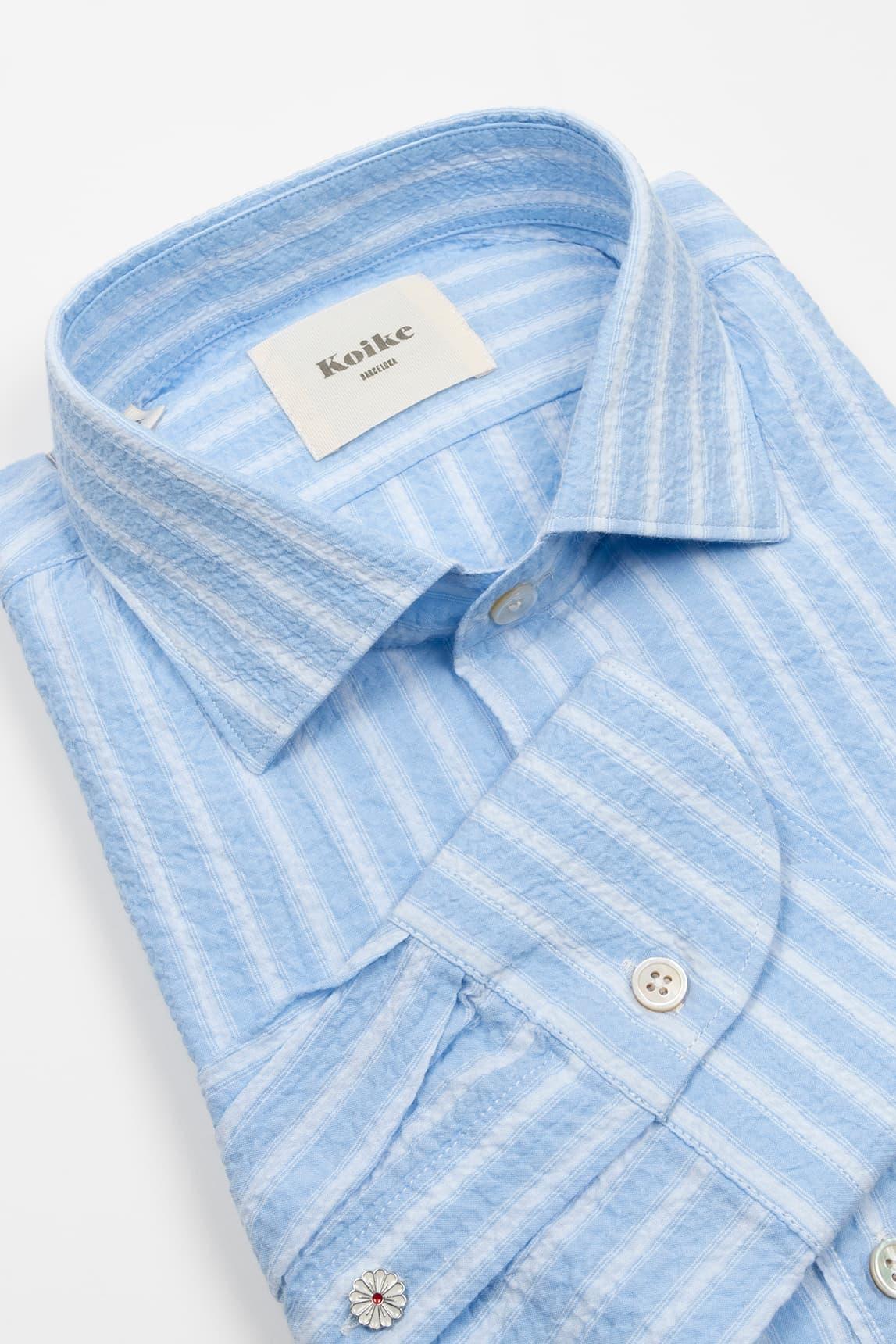 La camisa Koike Hikari celeste raya ancha aporta un carácter más dinámico gracias a su patrón de rayas verticales amplias en tono celeste sobre base blanca. Confeccionada en algodón suave, ofrece comodidad y estructura equilibrada para el día a día.