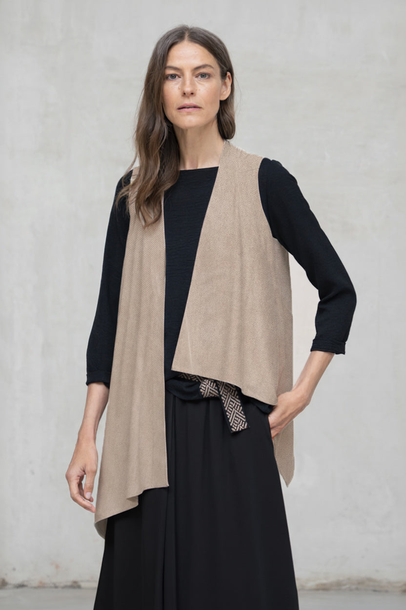 El chaleco Varenna en color arena claro es un fondo de armario que aporta calidez y sofisticación instantánea. Su silueta abierta y la fluidez del tejido lo convierten en una pieza versátil para crear capas elegantes tanto de día como de noche.