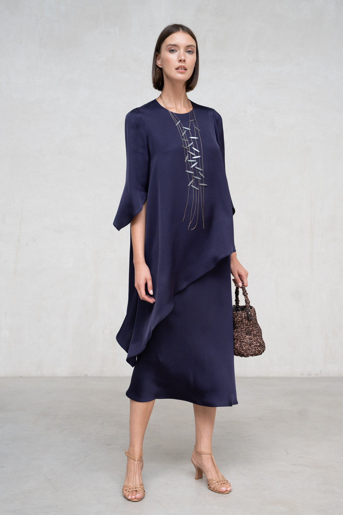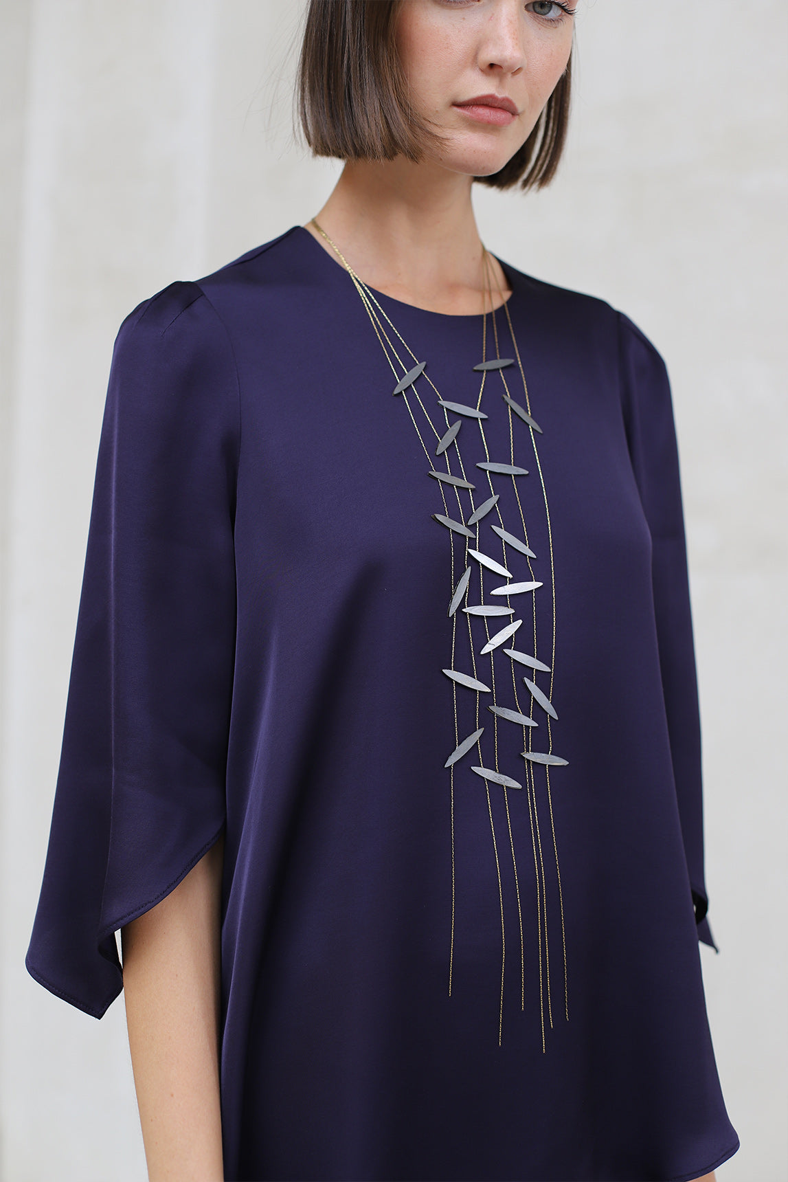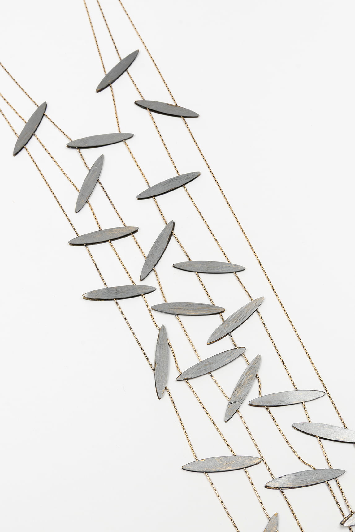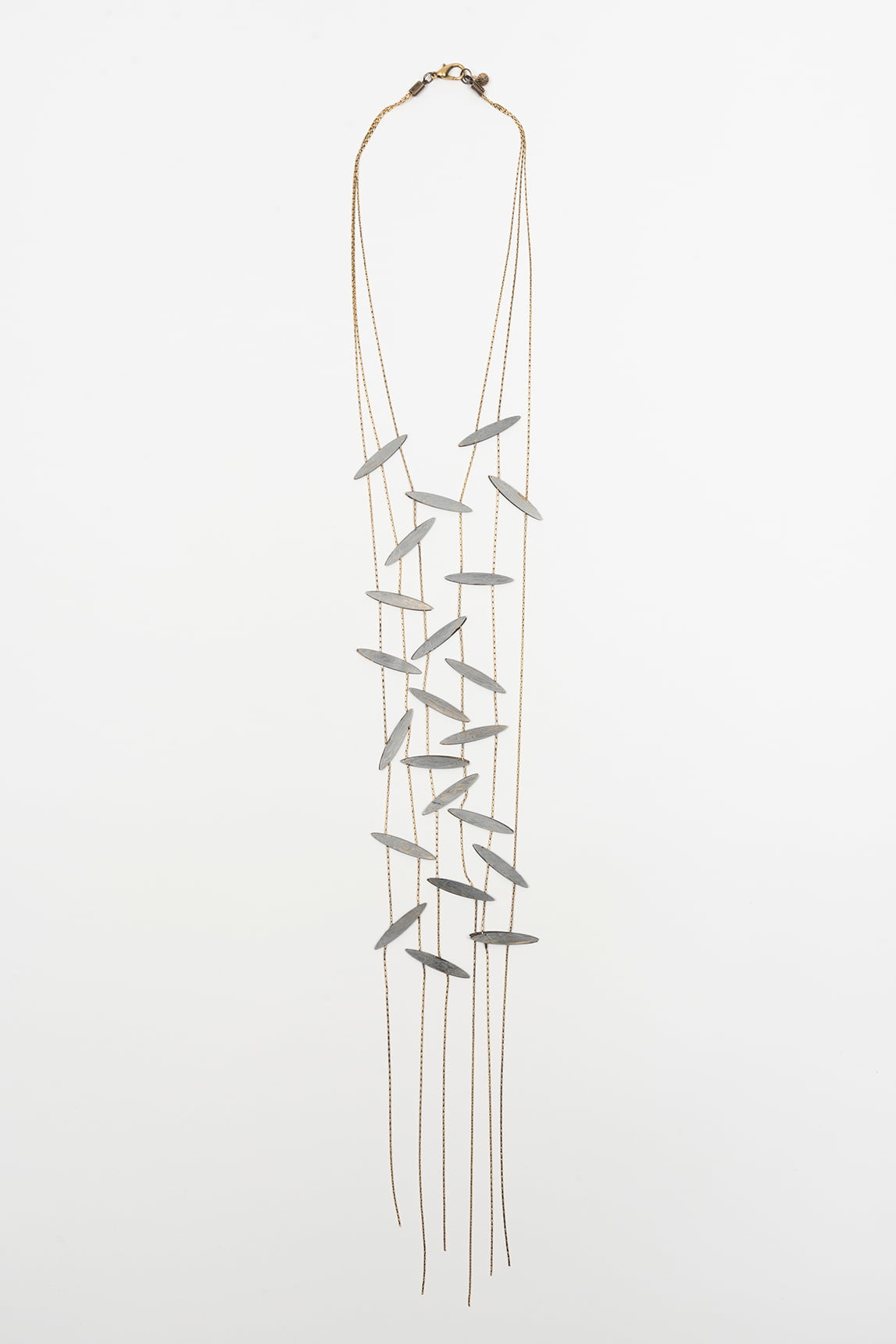 Este colar comprido destaca-se pela sua estrutura de múltiplos fios dourados em cascata, decorados com ferragens prateadas em forma de cápsula. O seu design etéreo e sofisticado acrescenta movimento e brilho subtil a qualquer look, tornando-o o complemento ideal para estilos monocromáticos, camisas largas ou vestidos fluidos. Uma peça versátil que confere um toque artístico e moderno com um toque artesanal.